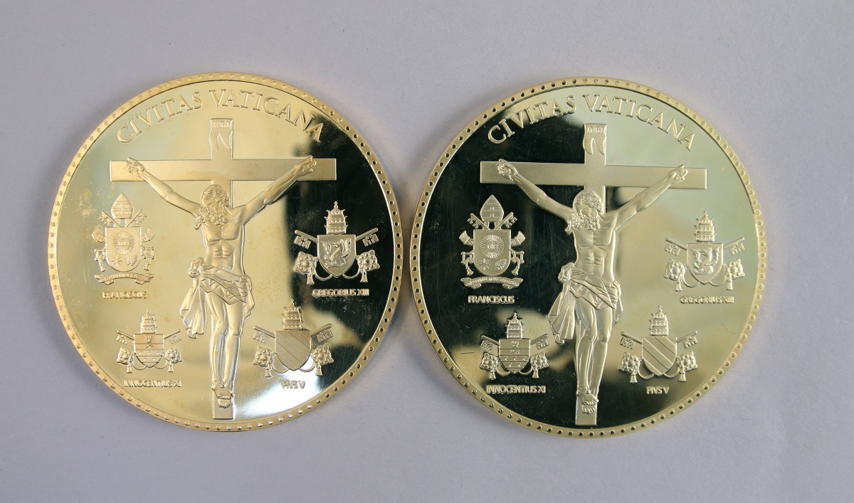 PAIRE de MÉDAILLES en métal doré. L'avers figure, pour l'une, le portrait du pape saint Pie V (lithographie) et la basilique Sainte-Marie-Majeure, et pour l'autre, le portrait du pape François et la basilique Saint-Pierre. Le revers titré "CIVITAS VATICANA" présente le Christ en croix flanqué des armes des papes François, Innocent XI, Grégoire XIII et saint Pie V.