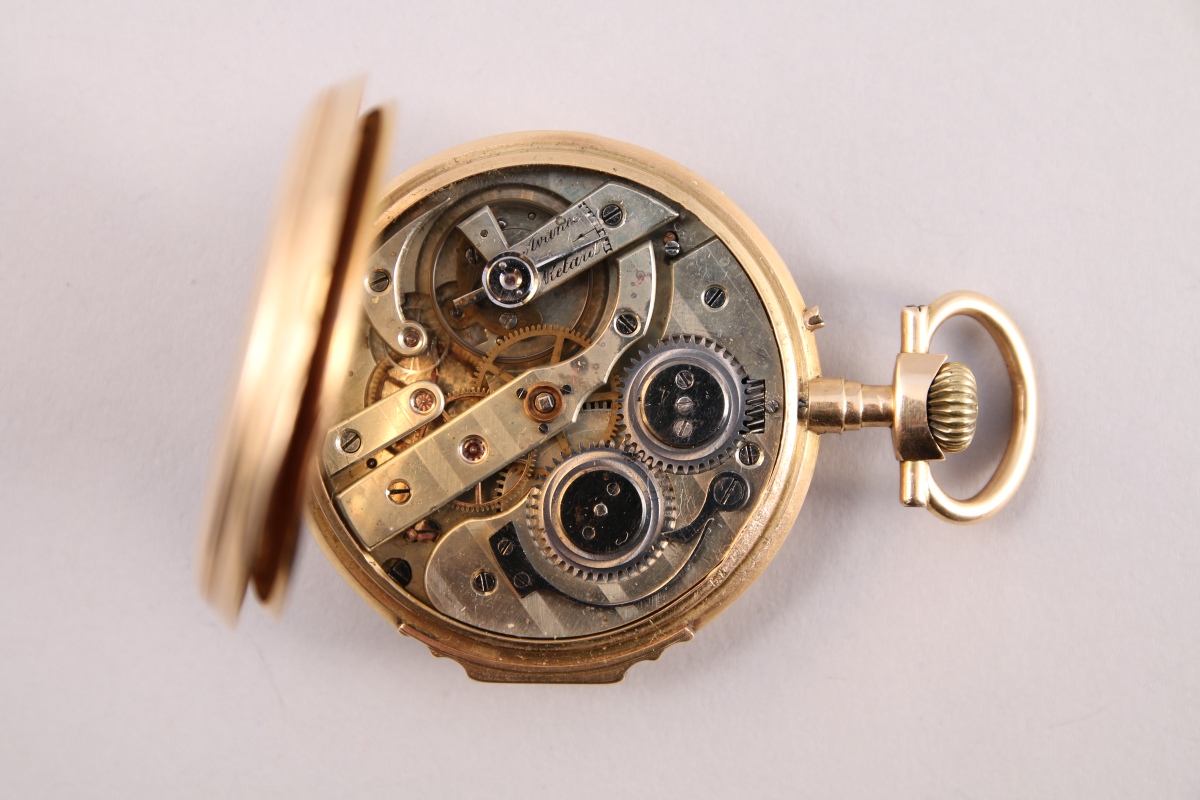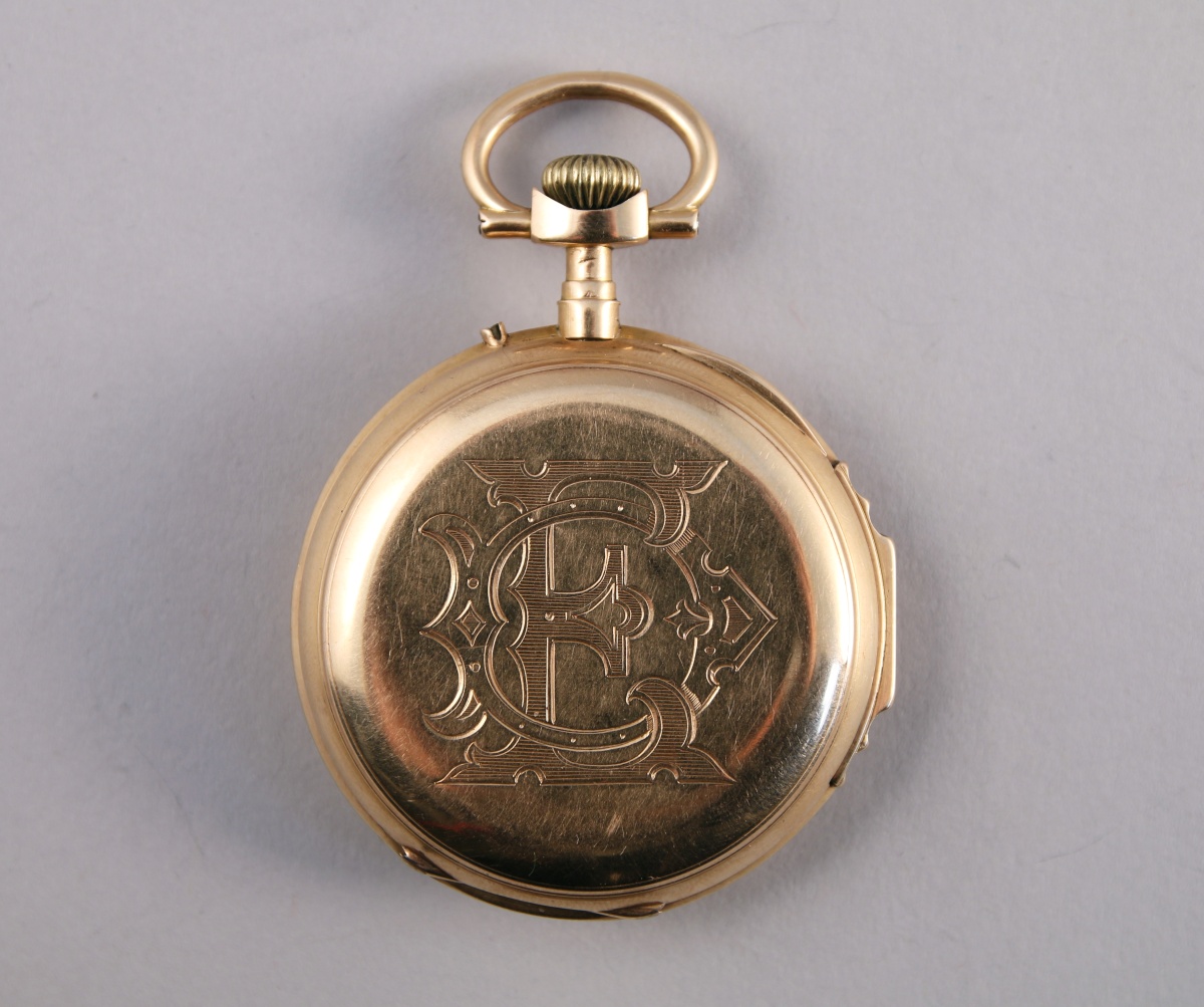 Belle MONTRE de GOUSSET en or jaune 18K, à double cadrans émaillés, le petit gradué à 6 heures avec la trotteuse des secondes , le grand gradué pour les minutes, les heures en chiffres romains et chaque période de 5 minutes en chiffres arabes. Remontoir à 6 heures. La cuvette monogrammée EO (?). Cache poussière en or gravé "Ancre ligne droite / Balancier compensé / Nickel / 19 rubis / Genêve".