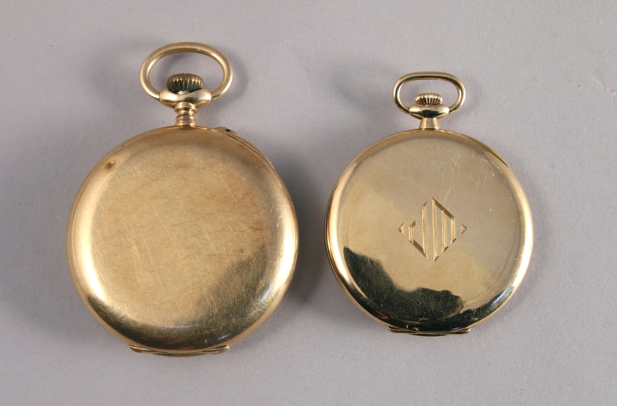 DEUX MONTRES de GOUSSET en or jaune 18K, à remontoir au pendant. Double cadran émaillé blanc pour l'une et à fond doré pour celle de la maison ZÉNITH.