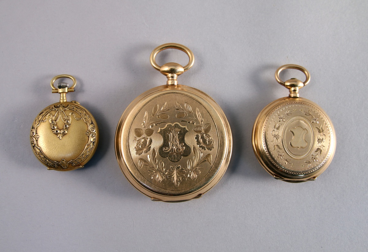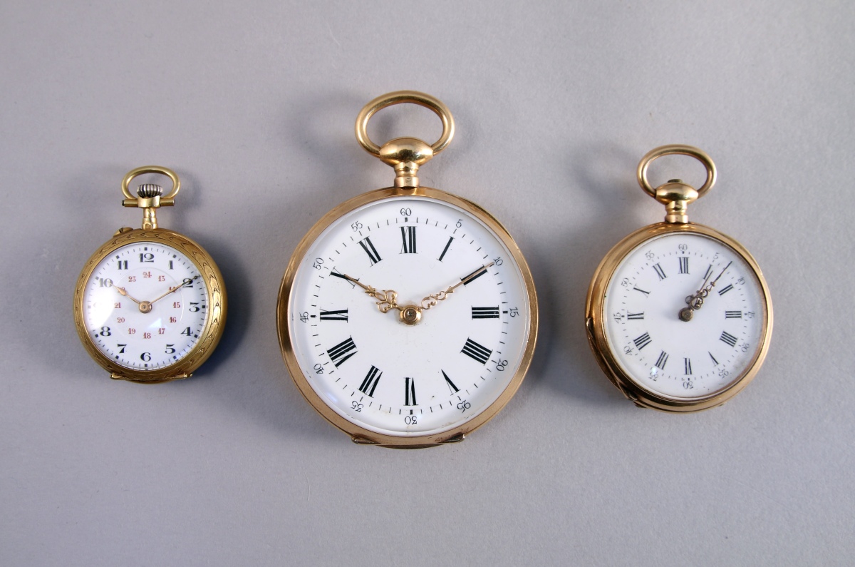 RÉUNION de TROIS MONTRES DE GOUSSET en or jaune: une d'homme à clef et deux de dame, l'une à clef, l'autre à remontoir au pendant.