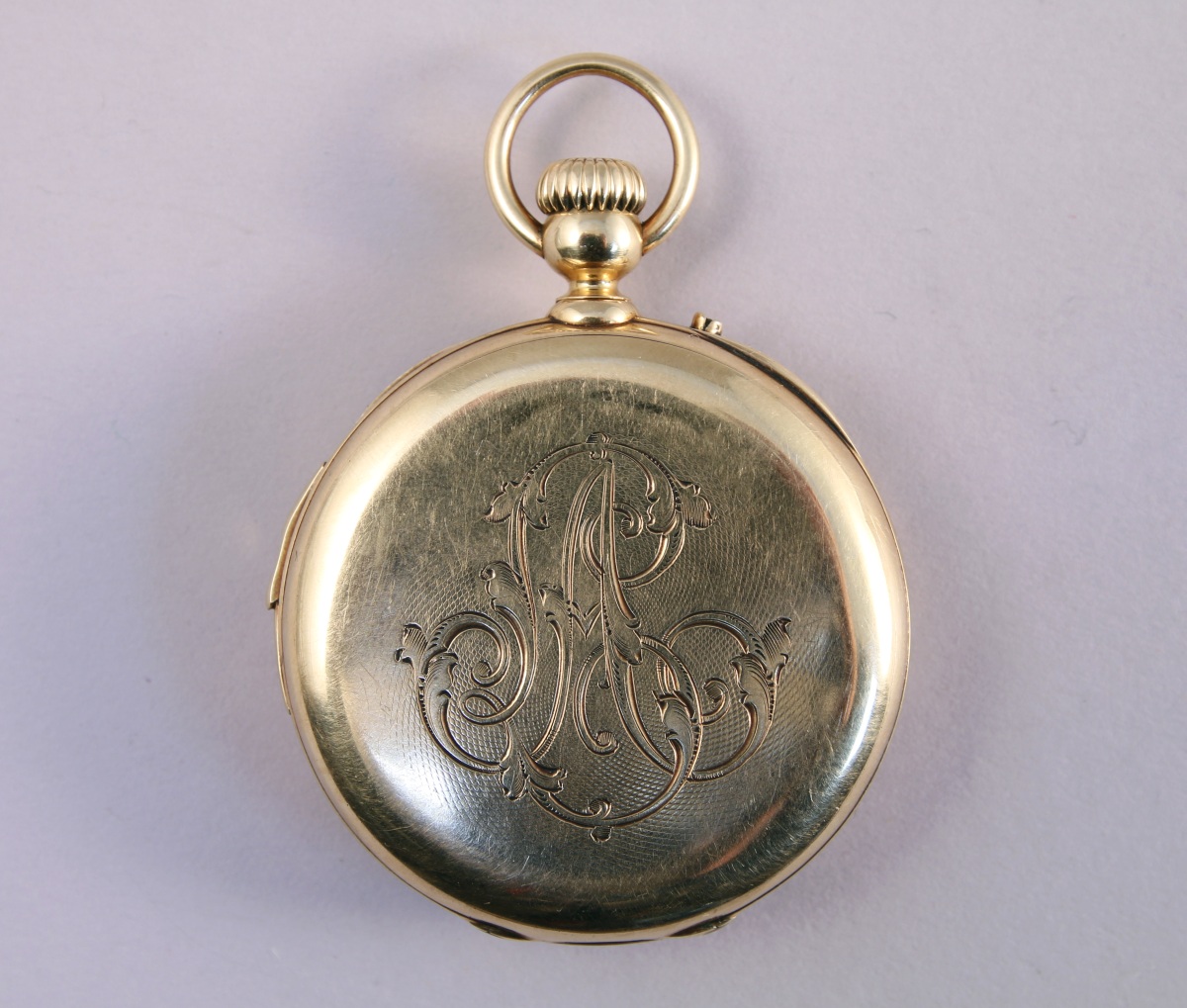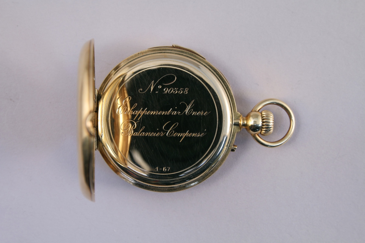 MONTRE de GOUSSET à sonnerie, heures et quarts, en or jaune à remontoir au pendant. Double cadran émaillé blanc indiquant les heures en chiffres romains et les minutes et secondes en chiffres arabes. Le dos du boîtier monogrammé "AL". Le cache-poussière numéroté 20358 et marqué "Echappement à Ancre / Balancier Compensé".