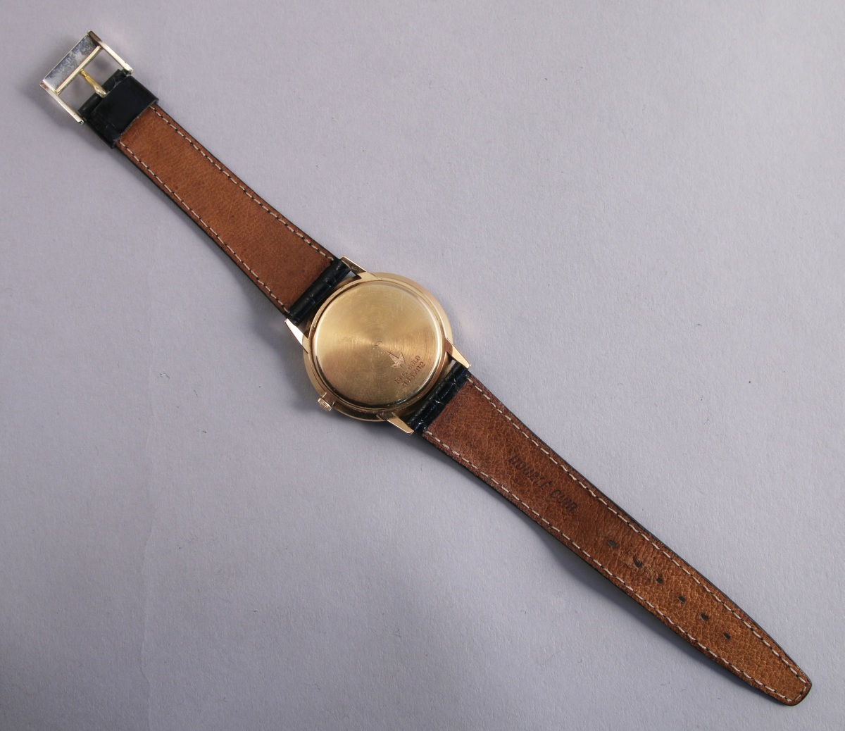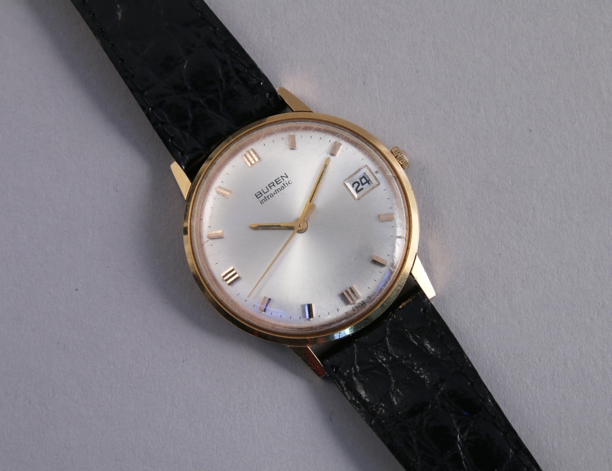 BUREN. MONTRE-BRACELET d'homme en or jaune 18K. Cadran argenté avec trotteuse centrale, mouvement automatique.
