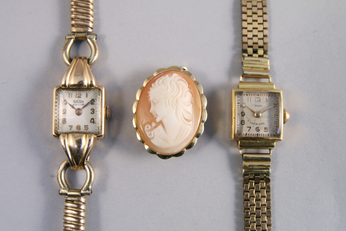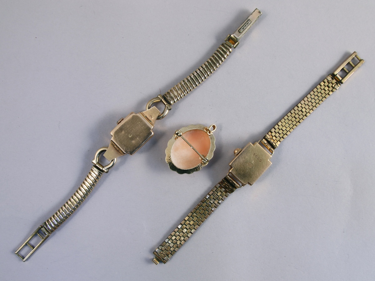 DEUX BOÎTIERS de MONTRES-BRACELETS de dame de forme rectangulaire en or jaune 18K. Cadran gradué pour les minutes avec les heures en chiffres romains. Remontoir à 3 heures. Avec leurs BRACELETS souples en métai doré.