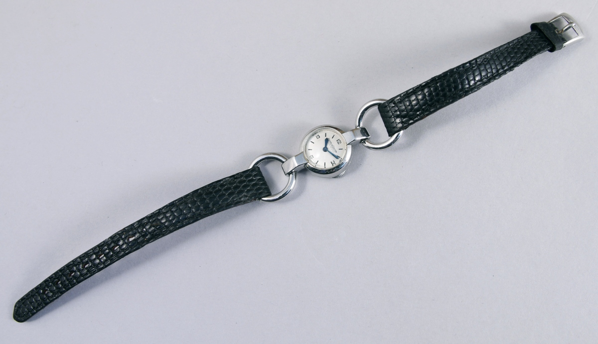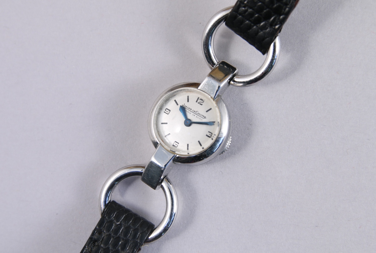 JAEGER-LECOULTRE. MONTRE-BRACELET de dame en acier avec remontoir sous le boîtier, cadran argenté, mouvement mécanique.
