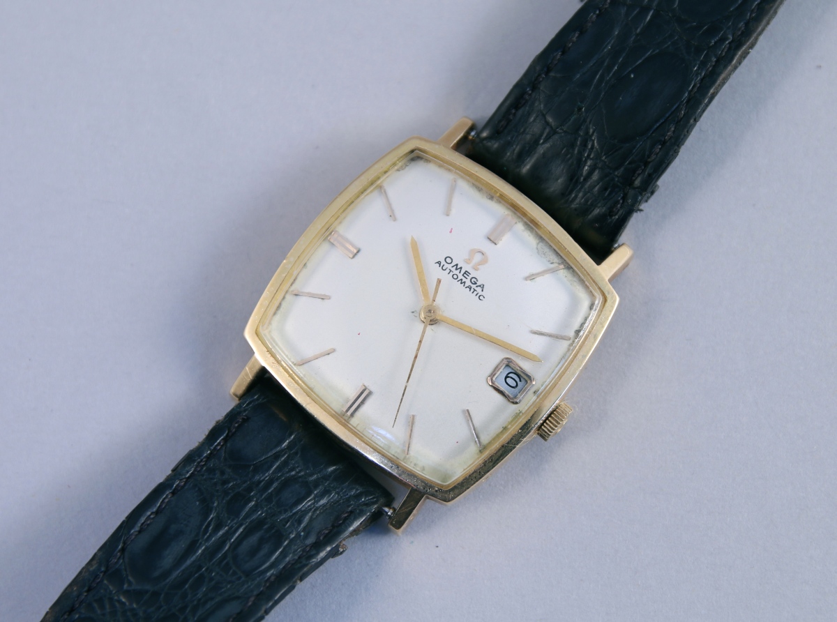 OMEGA. MONTRE BRACELET AUTOMATIC d'homme en or jaune 18K, le boitier quandragulaire marqué pour les heures avec un guichet dateur à 3 heures. Remontoir à 3 heures. Bracelet en cuir noir.