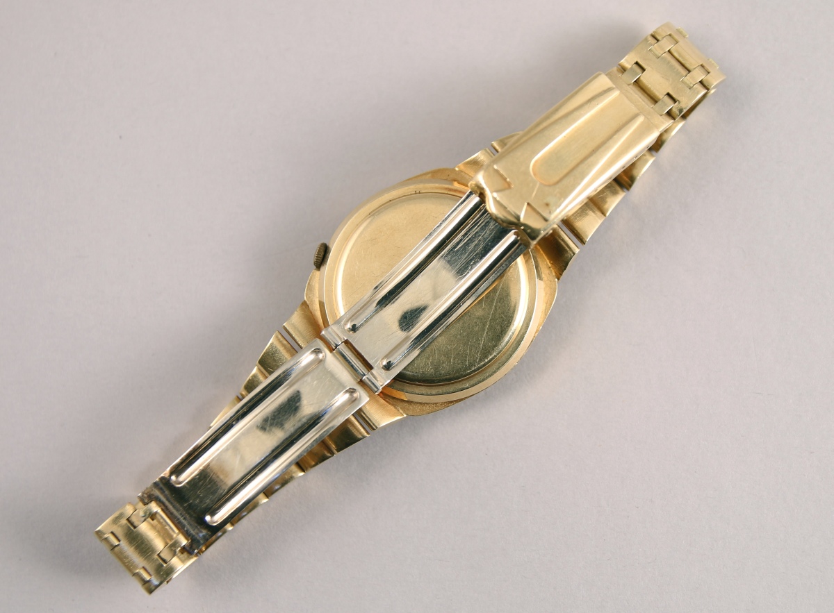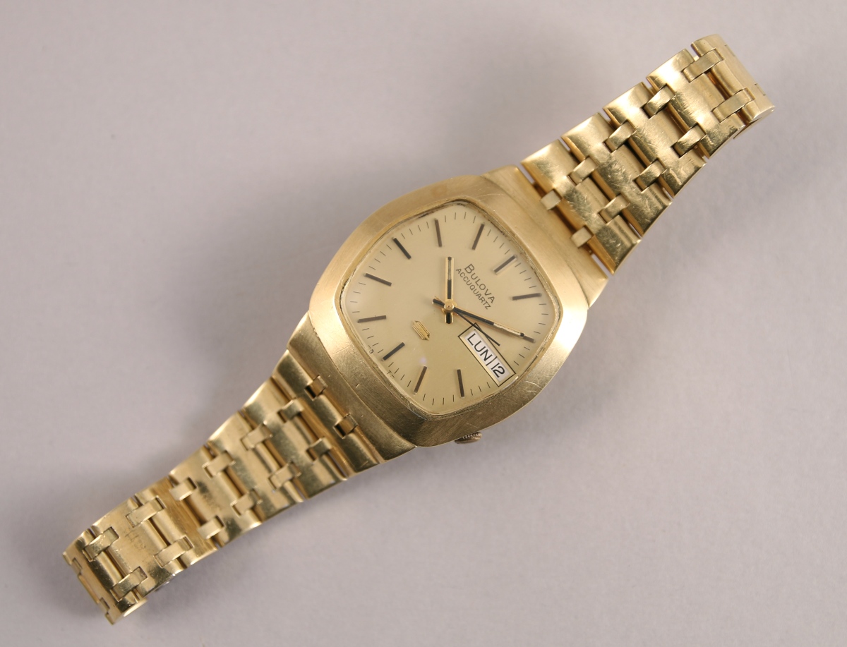 BULOVA. MONTRE-BRACELET d'homme en or jaune 18K. Bracelet articulé en or. (à charge)