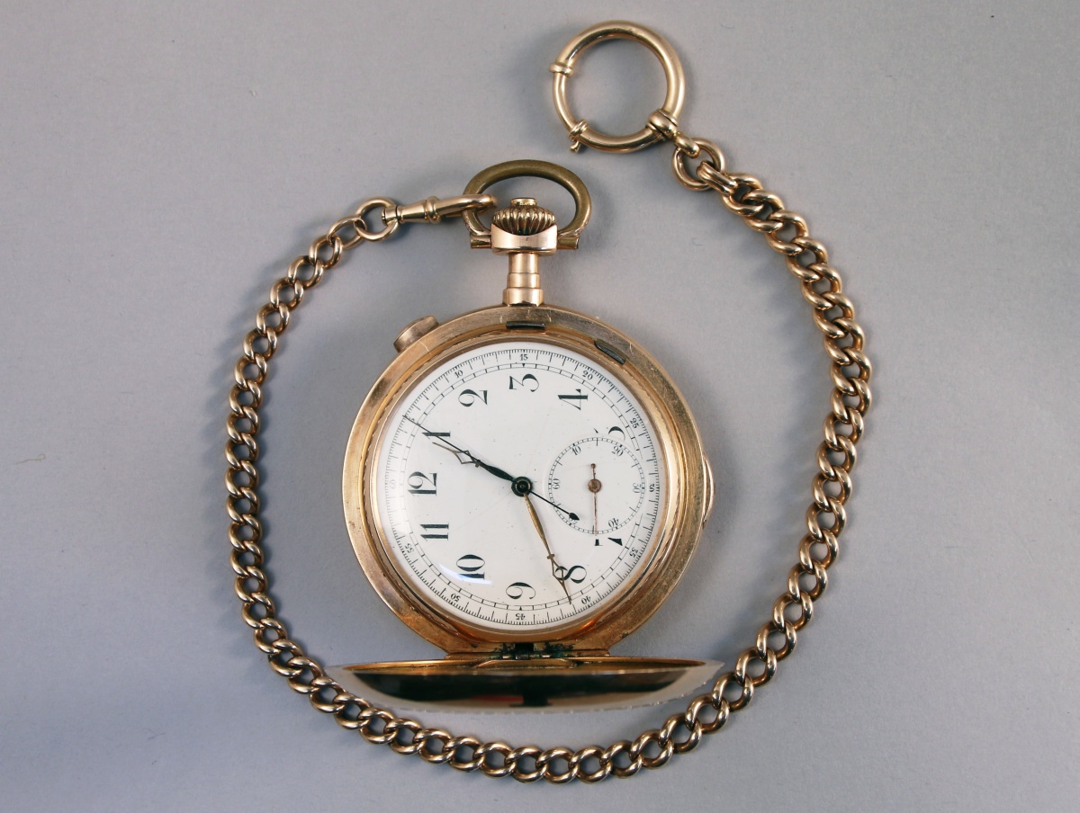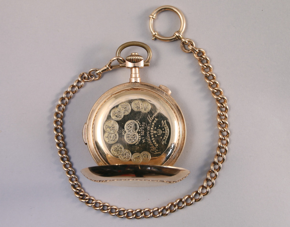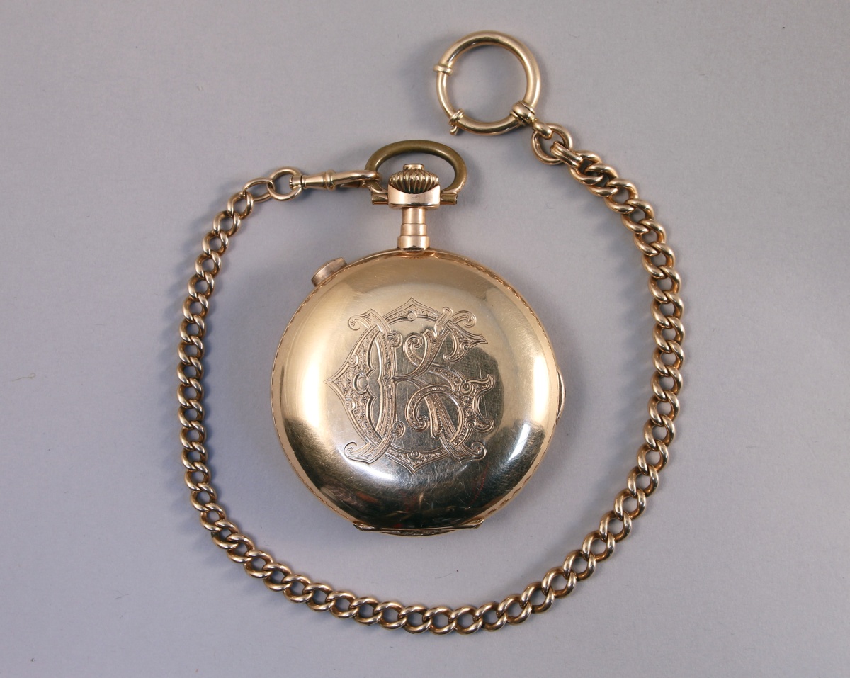 TEMPORA. CHRONOGRAPHE SAVONETTE à sonnerie en or jaune à remontoir au pendant. Cadran émaillé blanc indiquant les heures en chiffres arabes. Le boîtier monogrammé "GK". Cache-poussière signé et numéroté 337366.