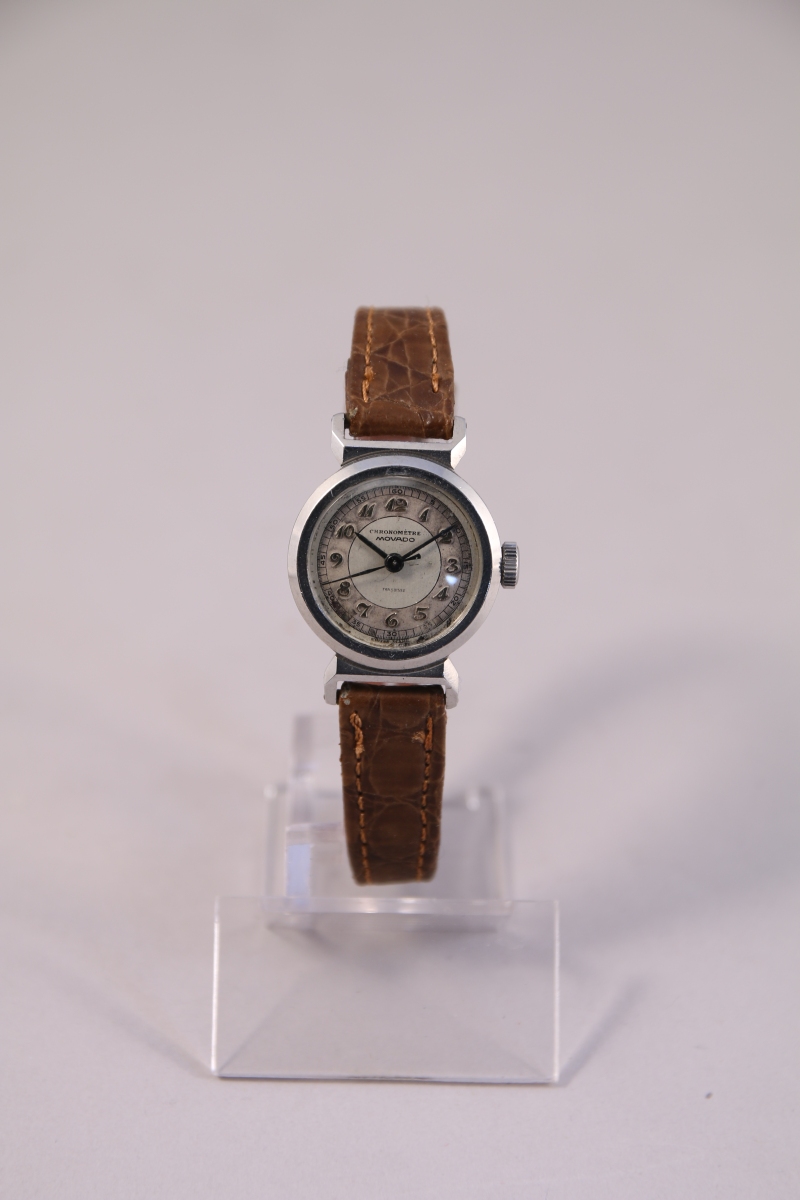 MOVADO. Chronomètre. Montre bracelet de dame en acier. Boîtier rond avec fond vissé. Cadran patiné avec trotteuse centrale et chiffres de style Breguet. Mouvement mécanique.