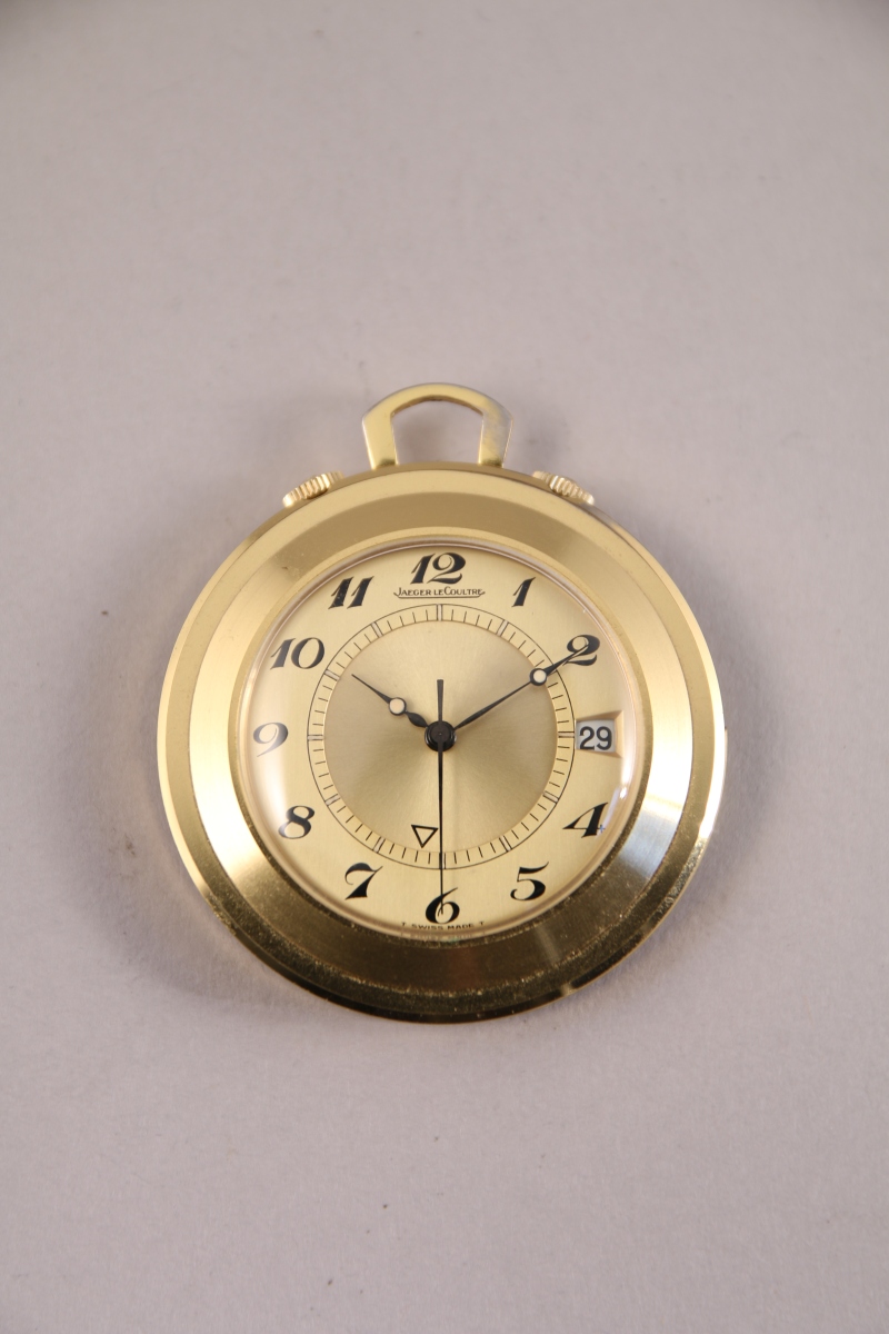 JAEGER-LECOULTRE. Montre de chevet et de sac avec fonction réveil. Boîtier rond avec fond vissé. Cadran champagne avec trotteuse centrale et date à guichet. Mouvement mécanique.