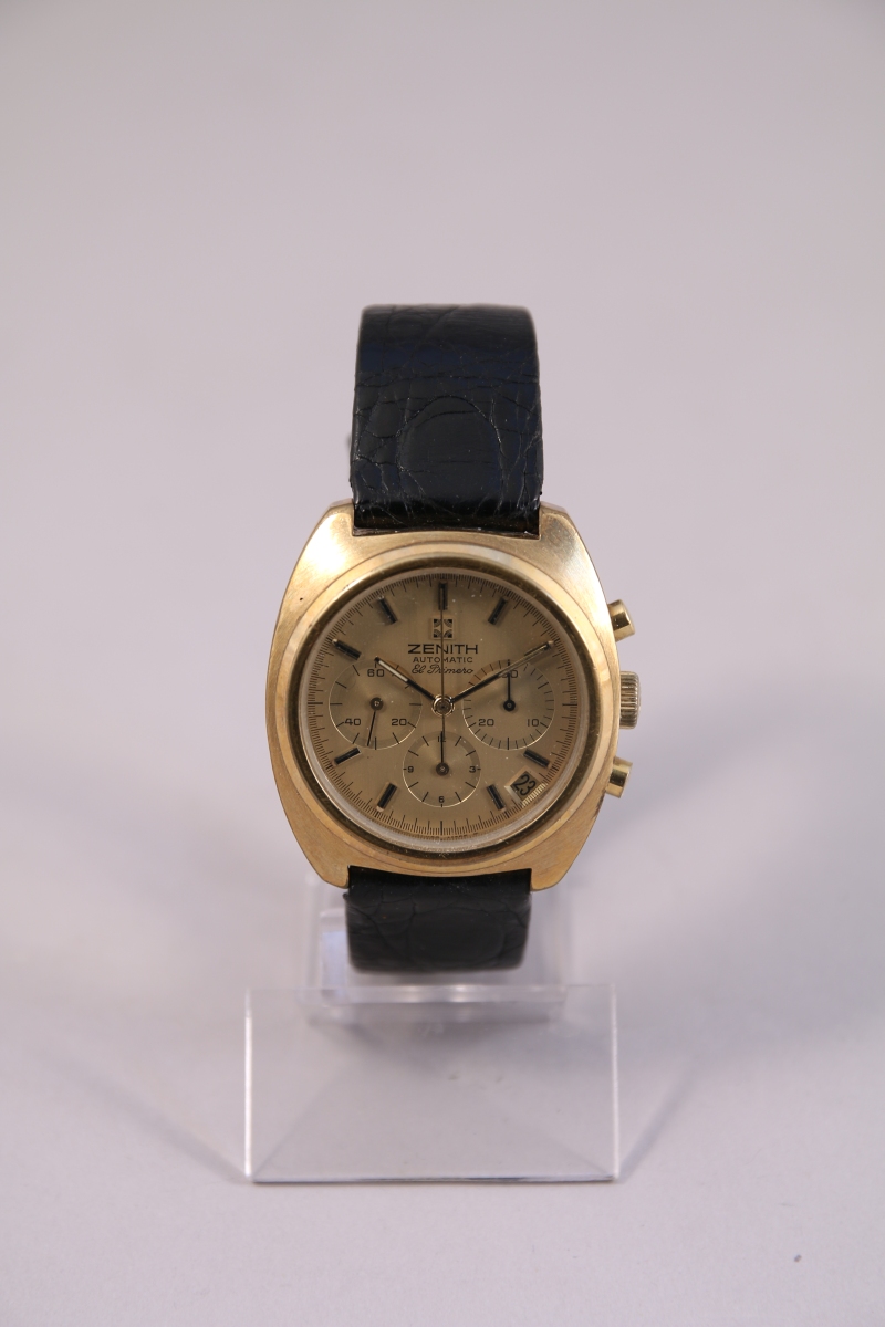 ZENITH. El Primero. Chronographe bracelet en acier et plaqué or. Boîtier tonneau avec fond vissé. Cadran doré avec trois compteurs et date à guichet. Mouvement automatique.