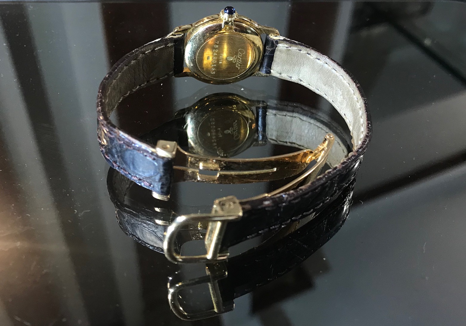 CARTIER. MONTRE " Le Must " de DAME en or jaune 18k de forme ronde. Cadran sigle, émaillé blanc, gradué pour les minutes avec les heures en chiffres romains, remontoir orné d'un saphir à trois heures. Boîtier numéroté 78240163 et gravé. Boucle ardillon en or jaune 18k et bracelet en cuir.