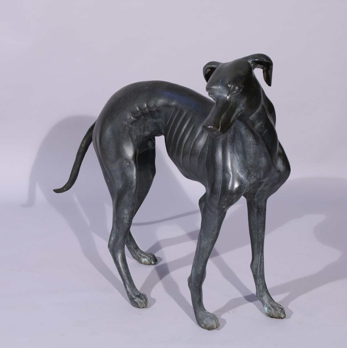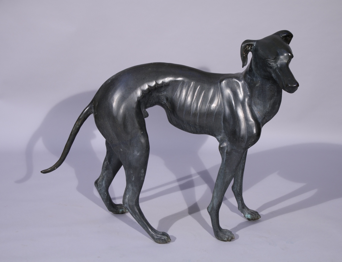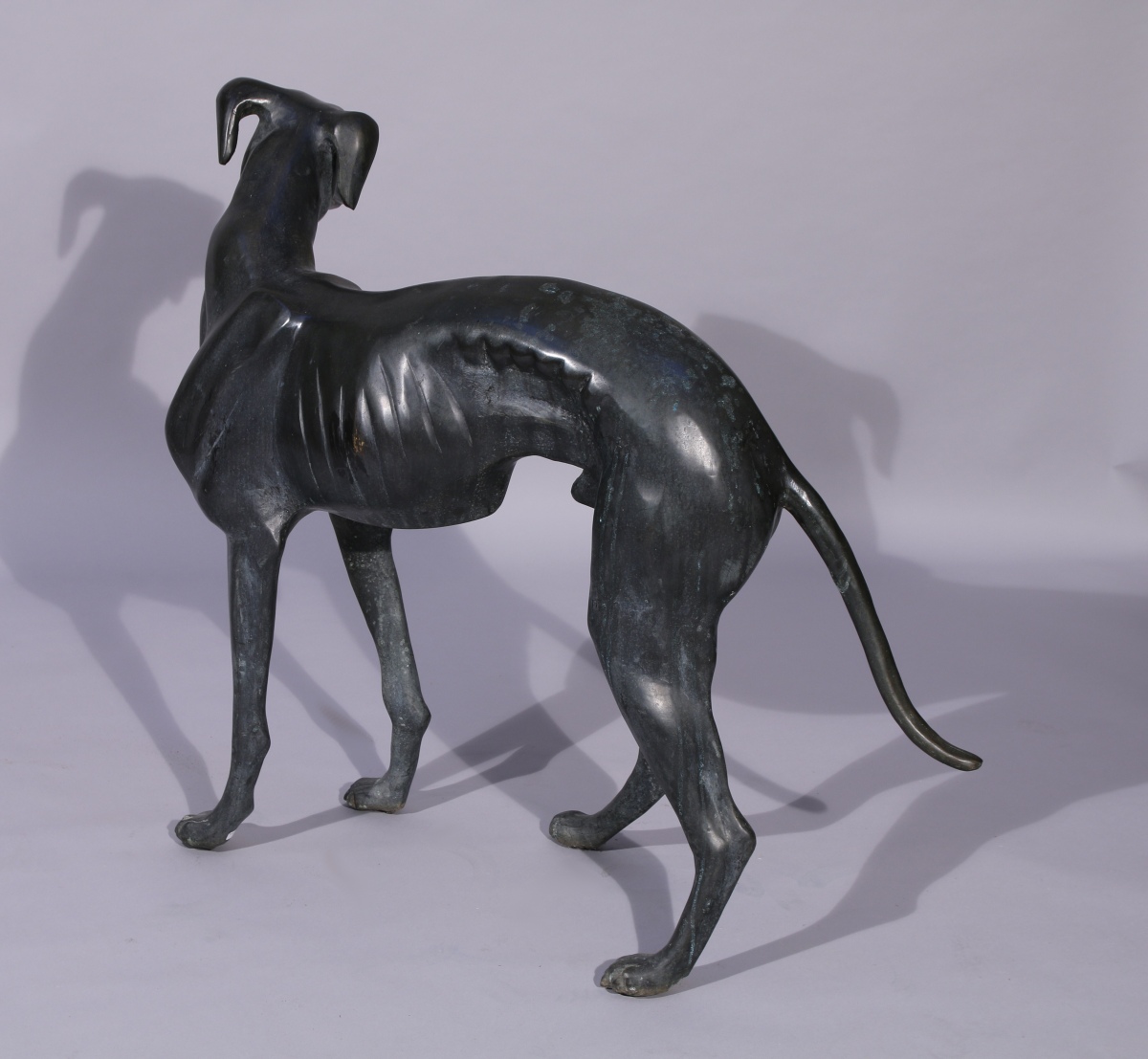 Grand LÉVRIER en bronze patiné, debout sur ses quatre pattes, regardant vers la droite.
