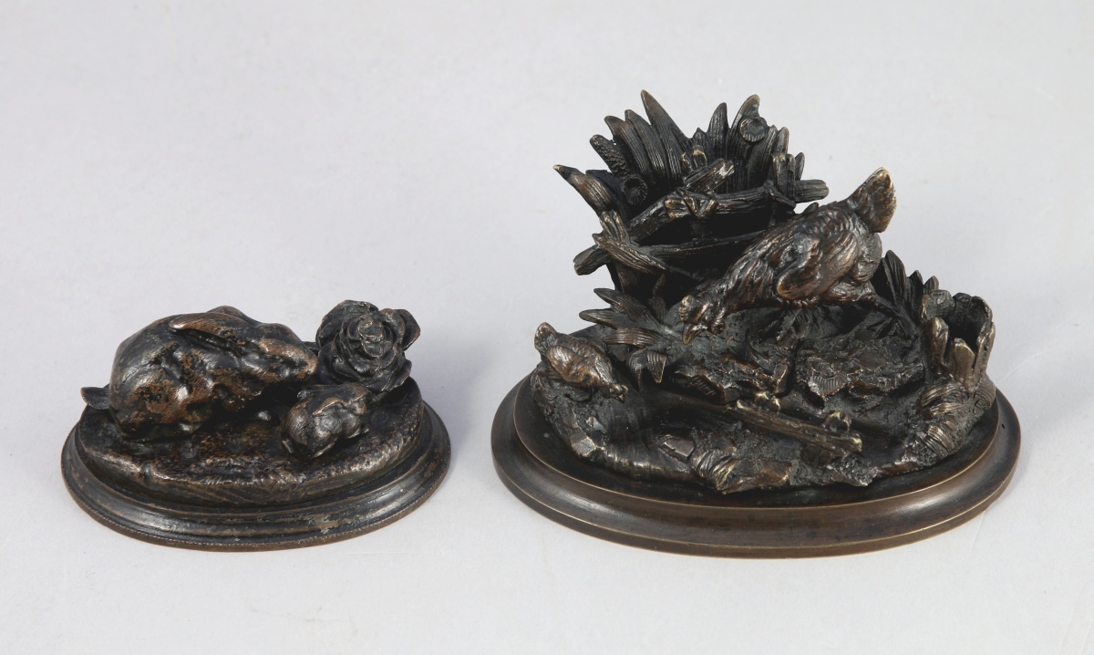 Bronze à patine brune. Haut. 3,5, Larg. 8,2, Prof. 5,8 cm. (usures sur le socle en bronze)