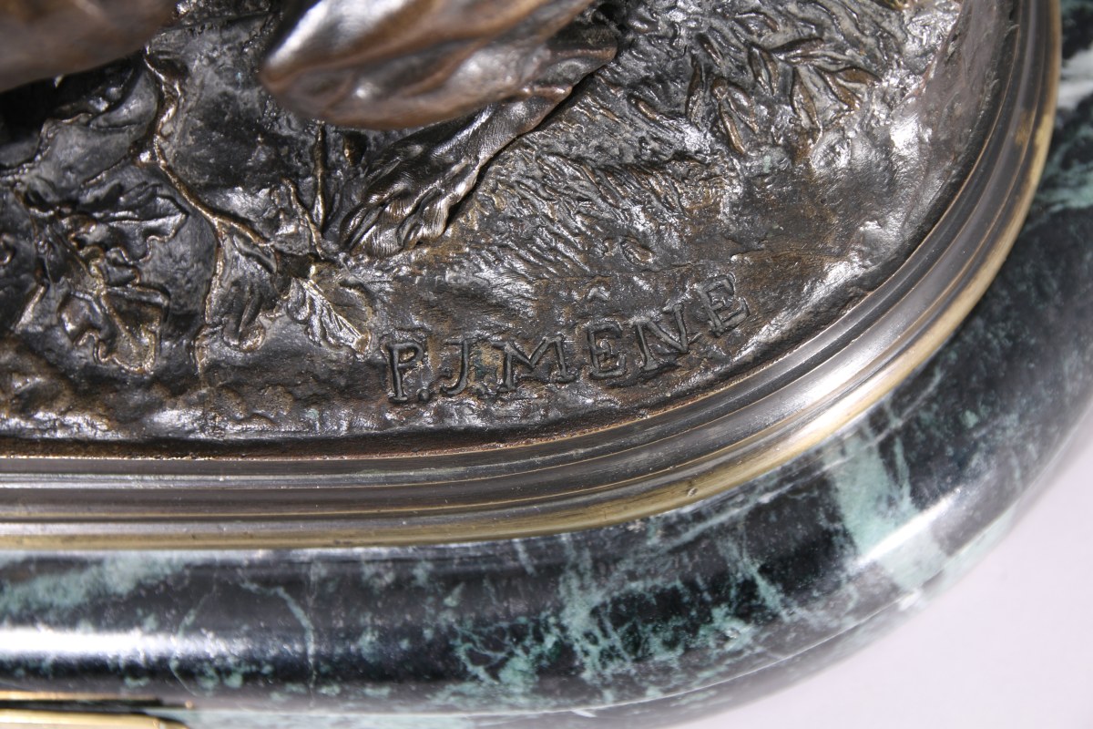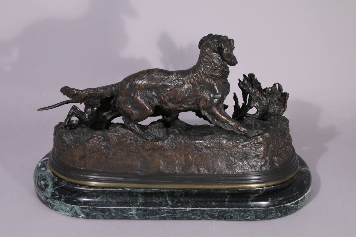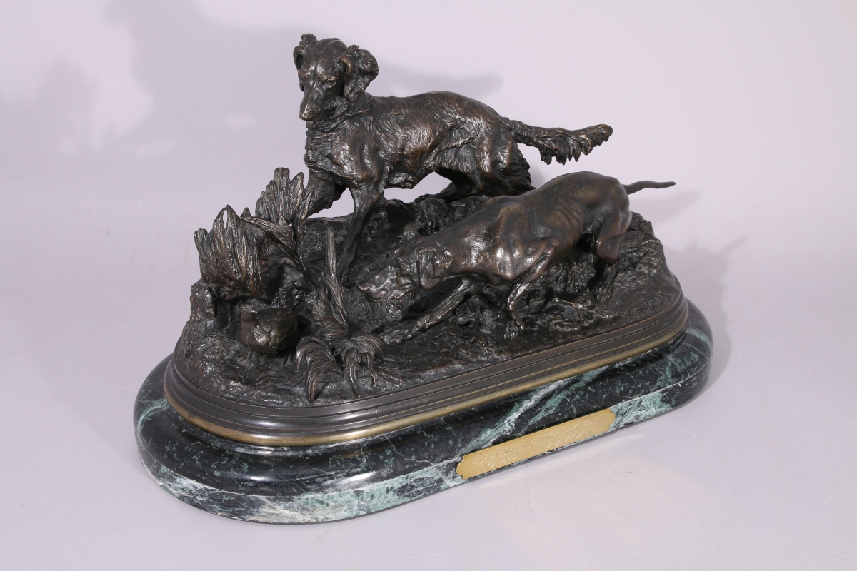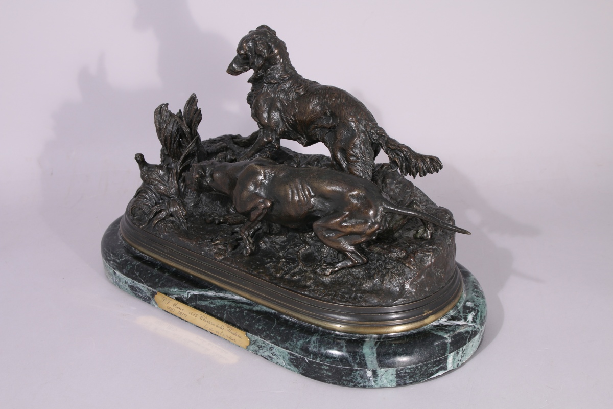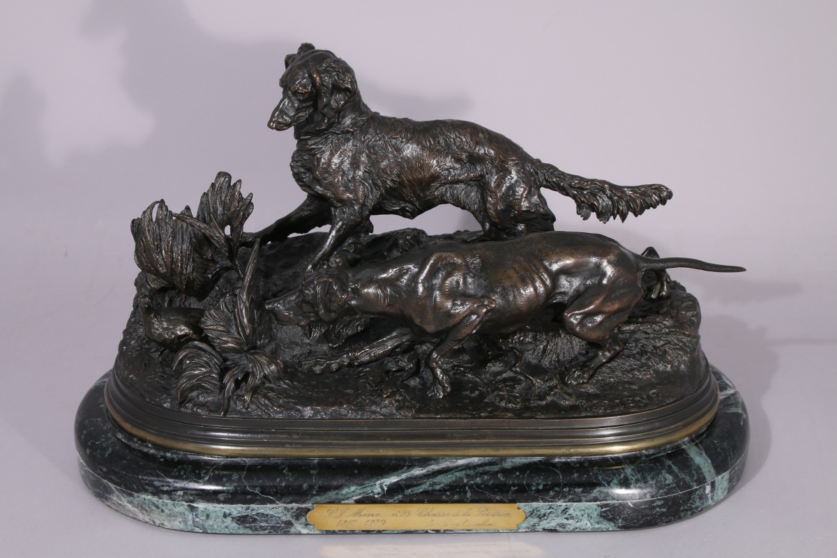 Bronze à patine brune monté sur un socle en marbre vert avec plaque en laiton portant inidquant "P. J. Mène 1810-1879, n° 25 Chasse à la perdrix, fonte de l'atelier".