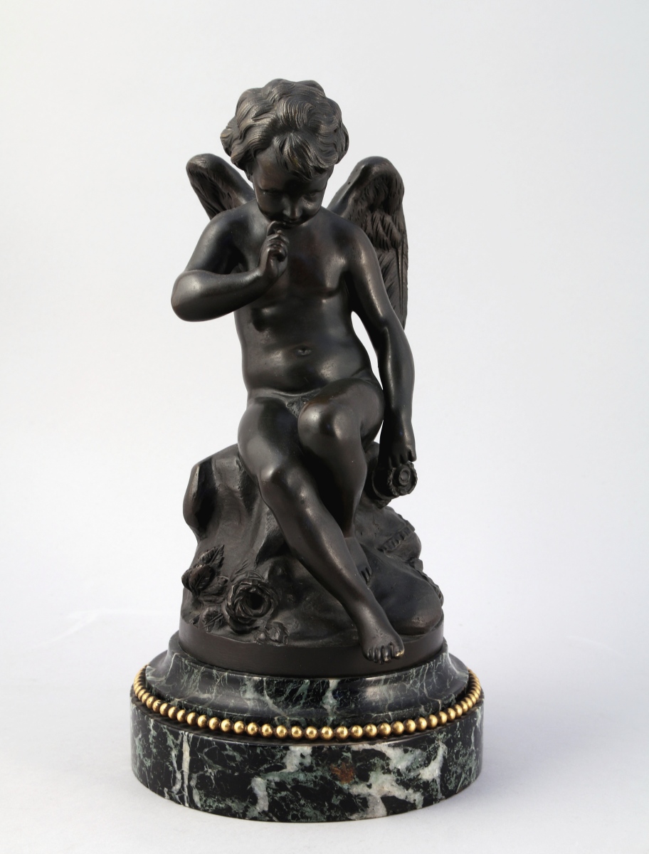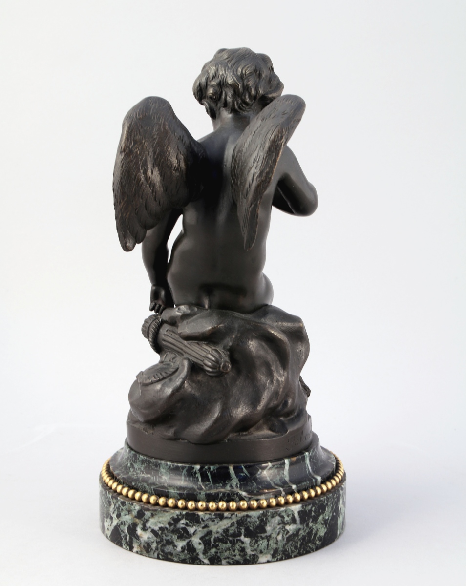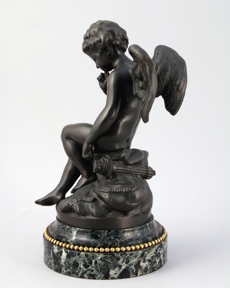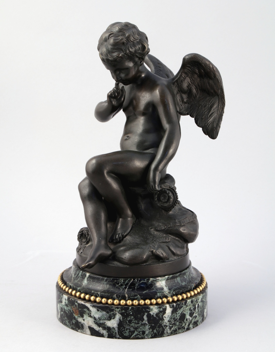 Bronze patiné. Socle de forme ronde en marbre vert de mer agrémenté d'un rais de perles en bronze doré.