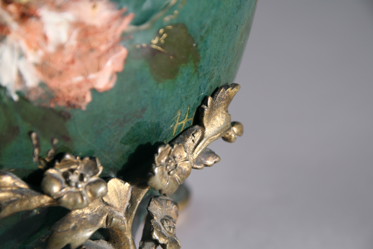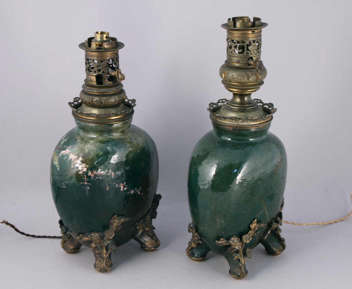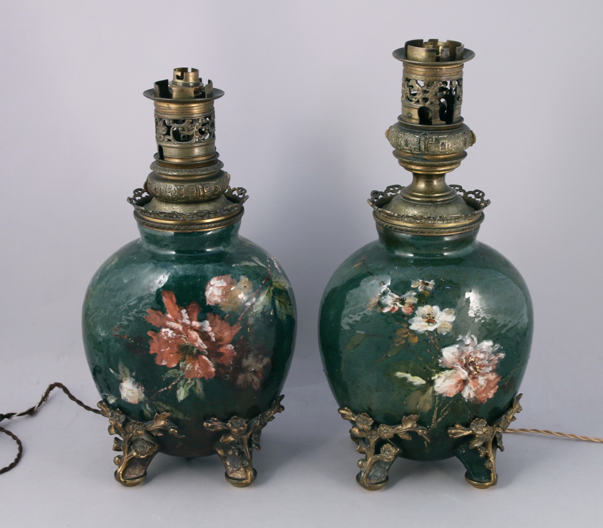 Paire de LAMPES en BARBOTINE IMPRESSIONNISTE à décors de fleurs de cerisiers sur un fond vert, en forme de gourde reposant sur quatre petits pieds par Jules Auguste Habert-Dys (1850-1930). Spectaculaire MONTURE en bronze à motifs de branches fleuries de cerisiers enveloppant chacun des pieds. Le col monté pour un éclairage à l'huile avec des cuivres gravés de fleurs de cerisiers et à motifs de chinoiseries.