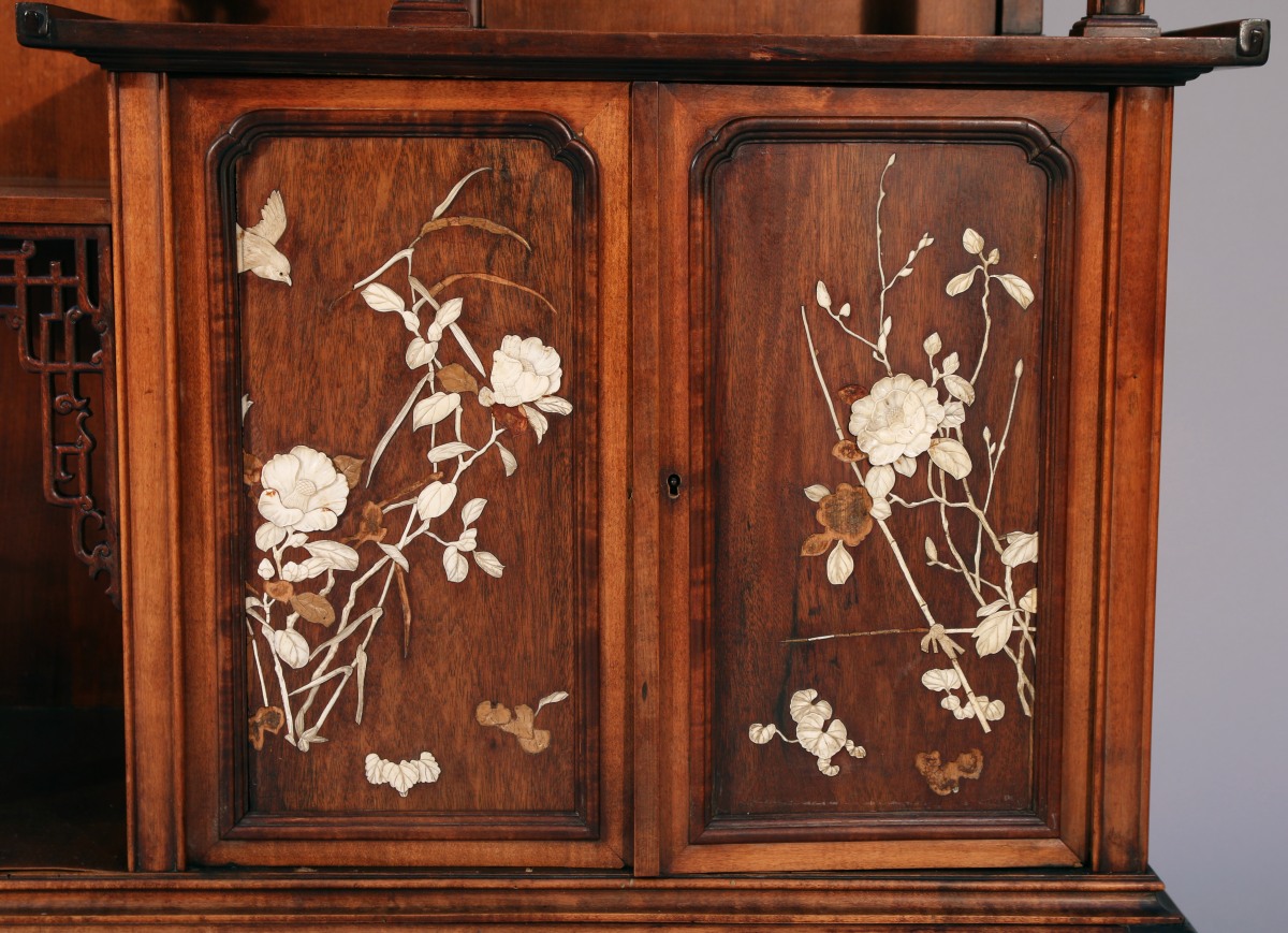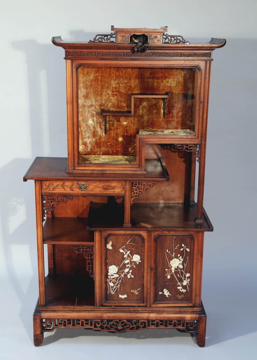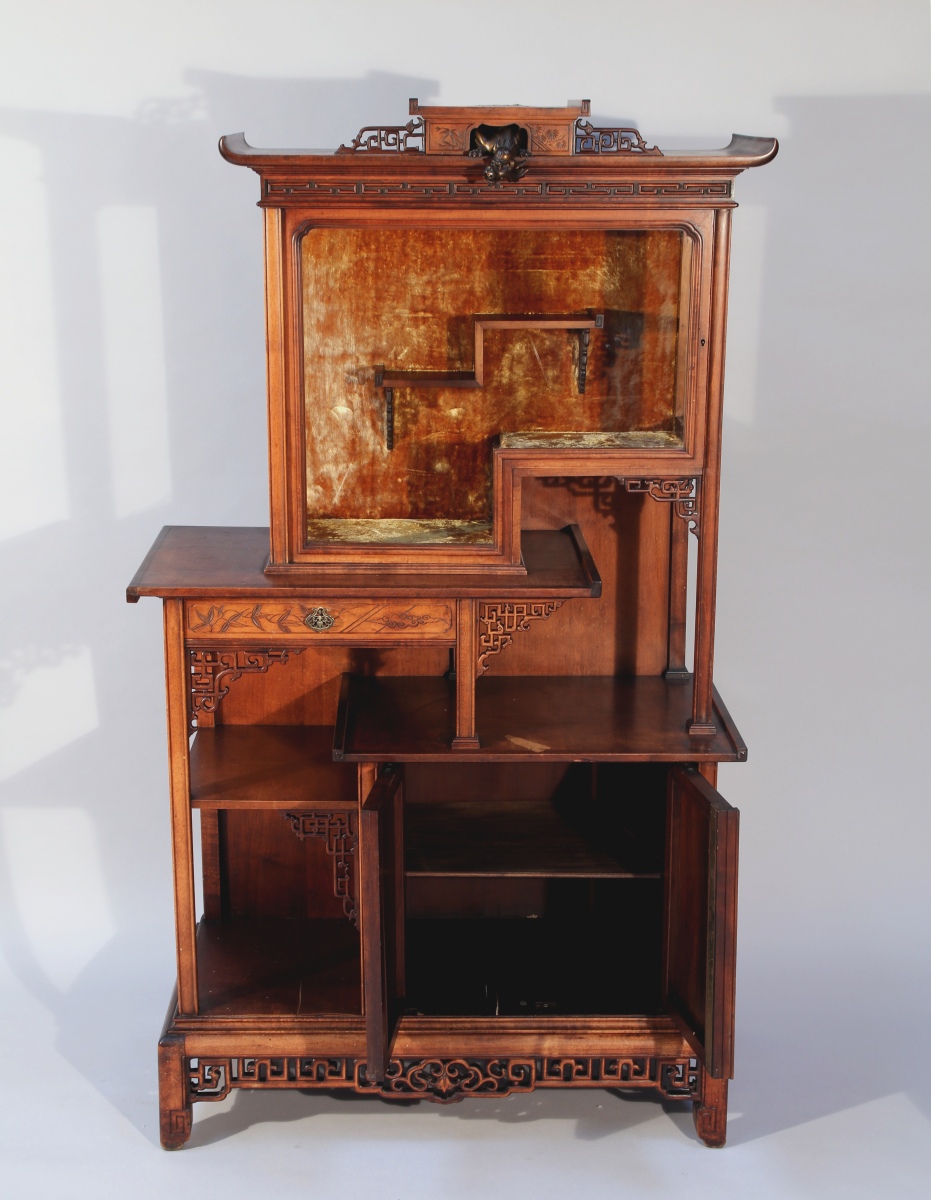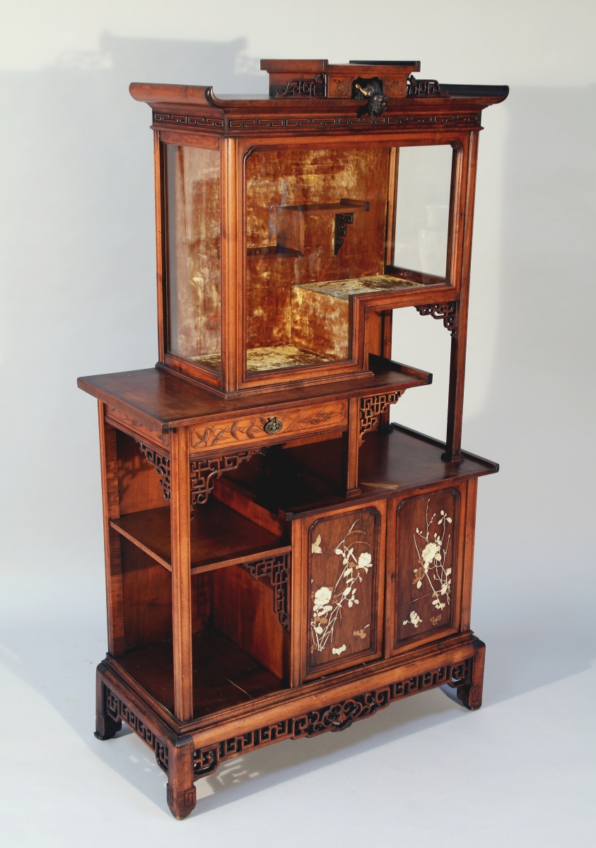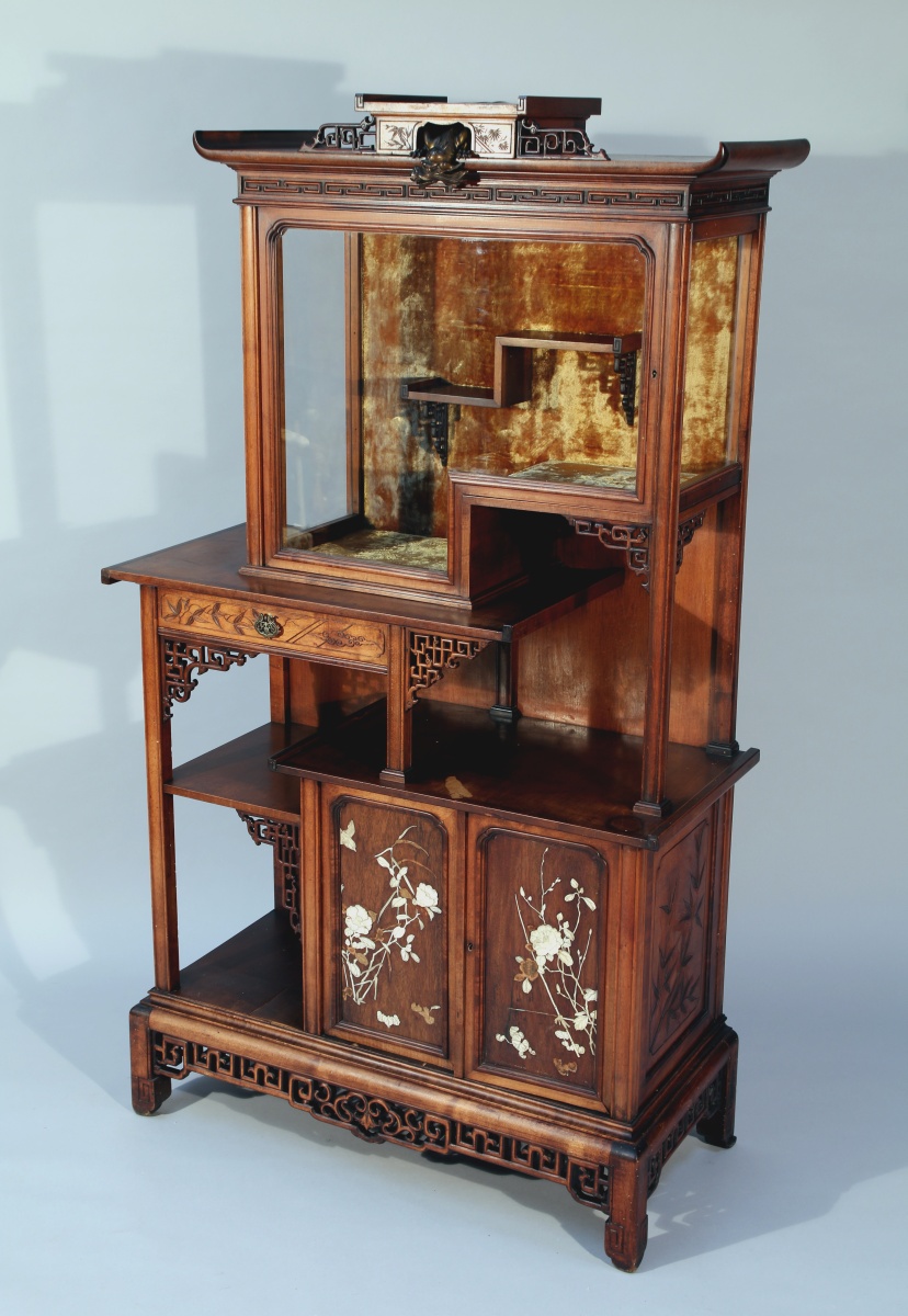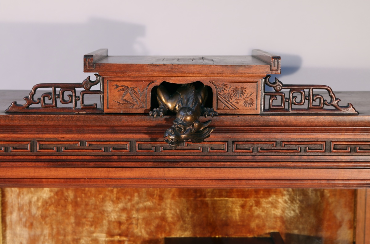VITRINE PAGODE en bois sculpté et gravé avec une ornementation en bronze d'un dragon sortant d'une niche dans la partie supérieure. Présentant trois niches, elle ouvre à une porte vitrée, deux vantaux et un tiroir. Incrustation d'oiseaux et de branchages fleuris en os sur les vantaux. Éléments ajourés en écoinçon en rappel sur les traverses inférieurs. Elle repose sur quatre pieds droits.
