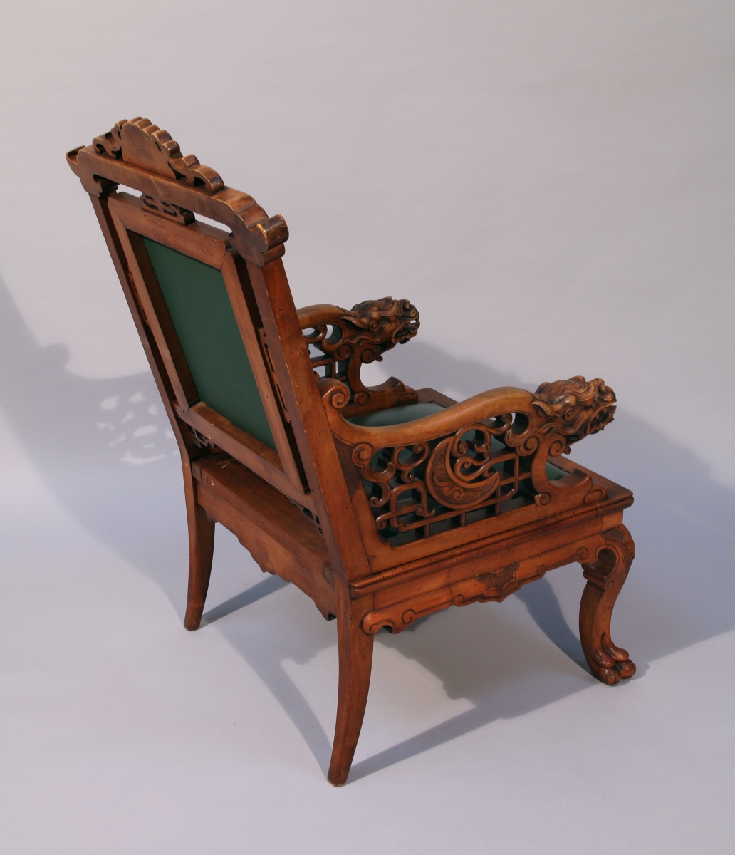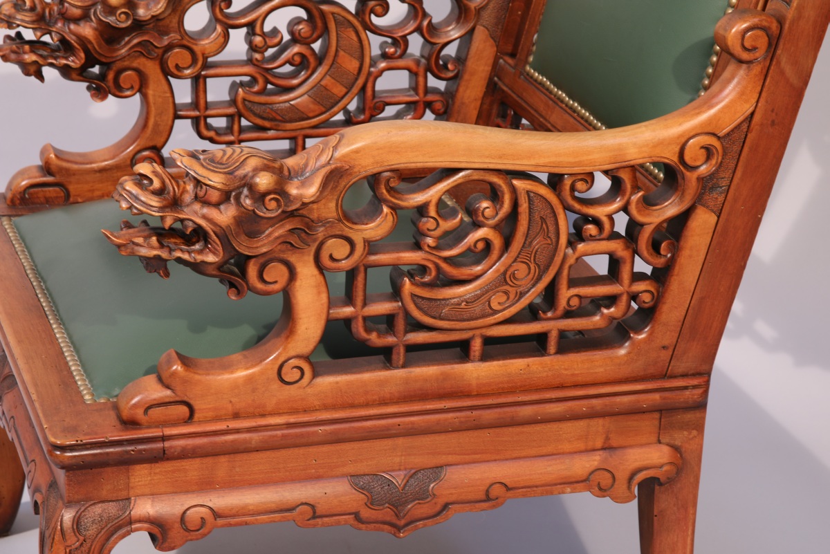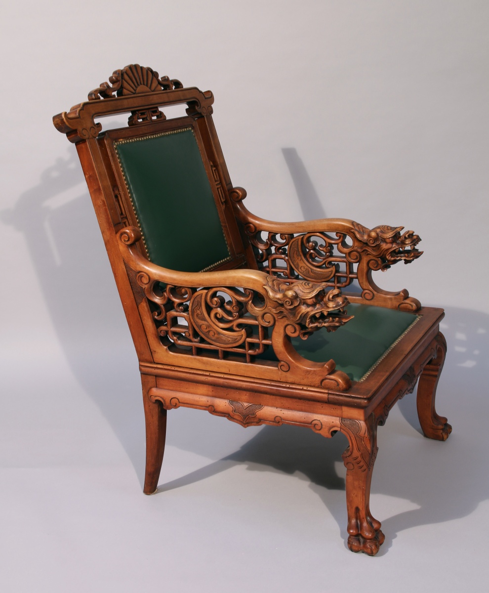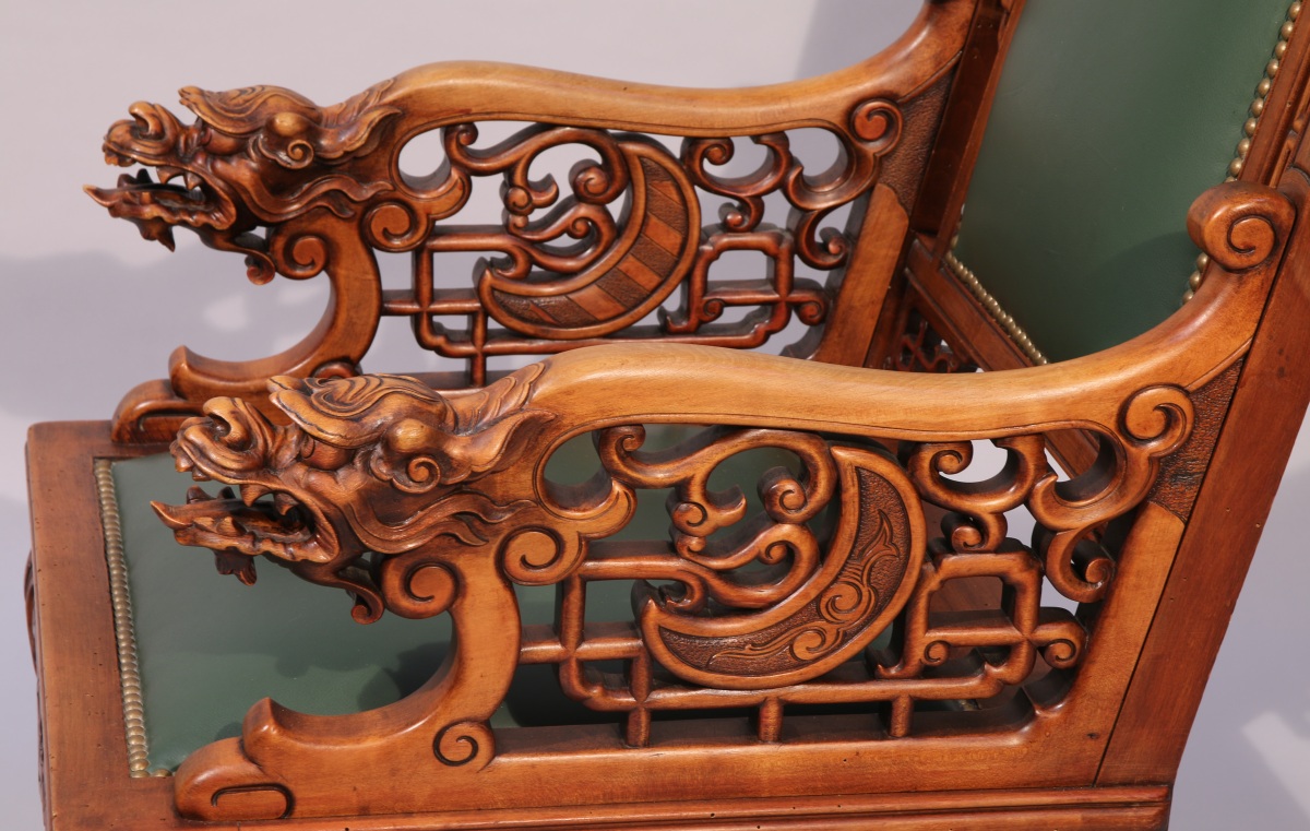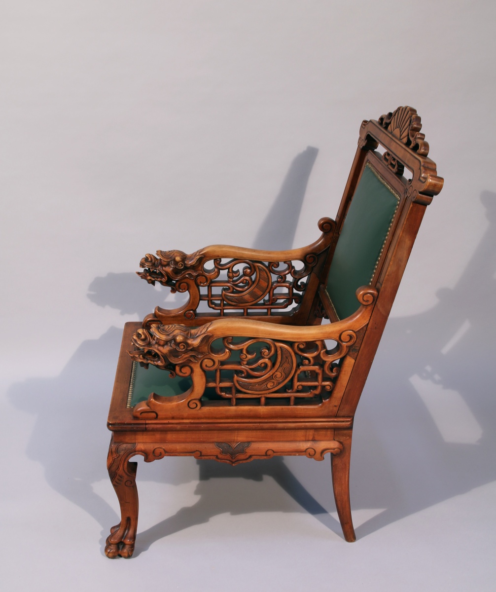 FAUTEUIL aux dragons en bois exotique sculpté et gravé. Le dossier ajouré de forme rectangulaire est orné d'une coquille épanouie ; deux dragons grimaçant sculpté sur les accotoirs, à décor ajouré de croissant de lune dans des enroulements. Il repose des pieds antérieurs cambrés terminé par des griffes et les pieds postérieurs en sabre.