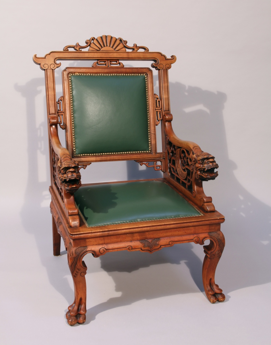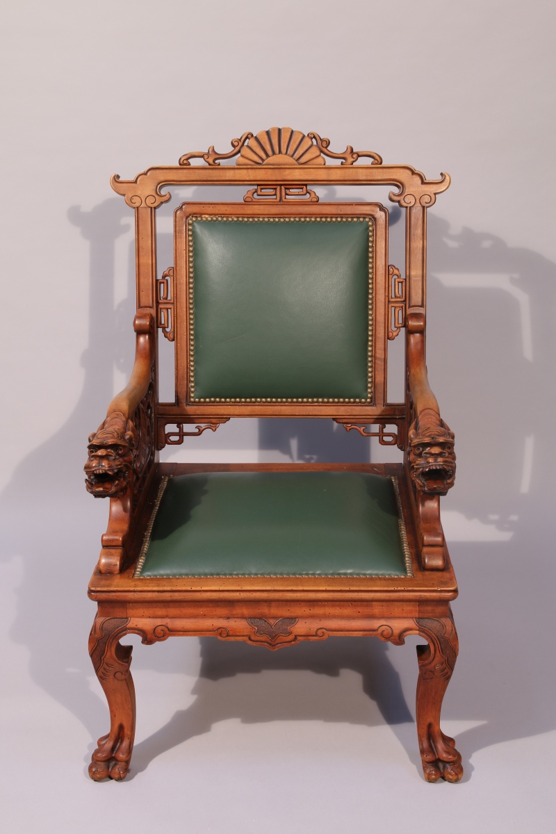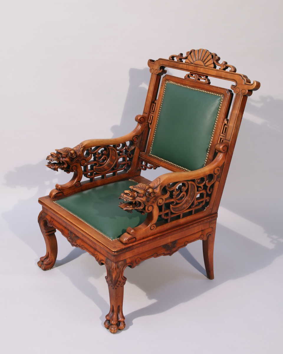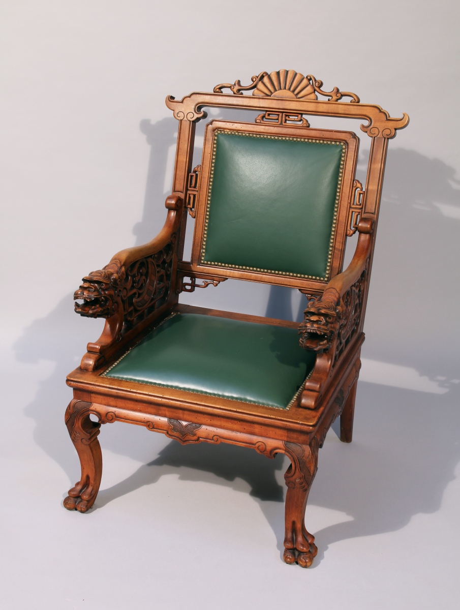 FAUTEUIL aux dragons en bois exotique sculpté et gravé. Le dossier ajouré de forme rectangulaire est orné d'une coquille épanouie ; deux dragons grimaçant sculpté sur les accotoirs, à décor ajouré de croissant de lune dans des enroulements. Il repose des pieds antérieurs cambrés terminé par des griffes et les pieds postérieurs en sabre.