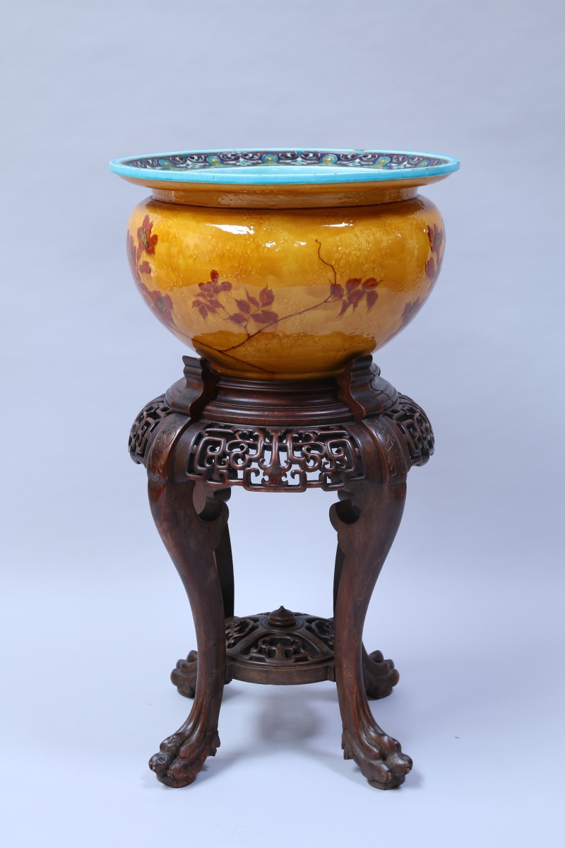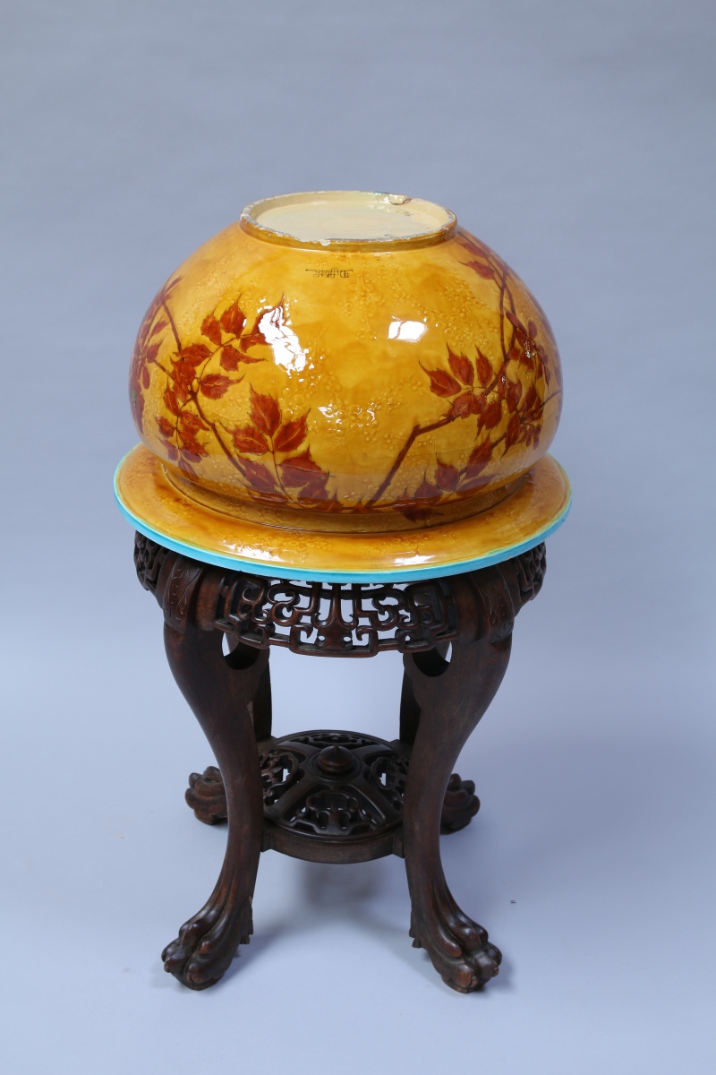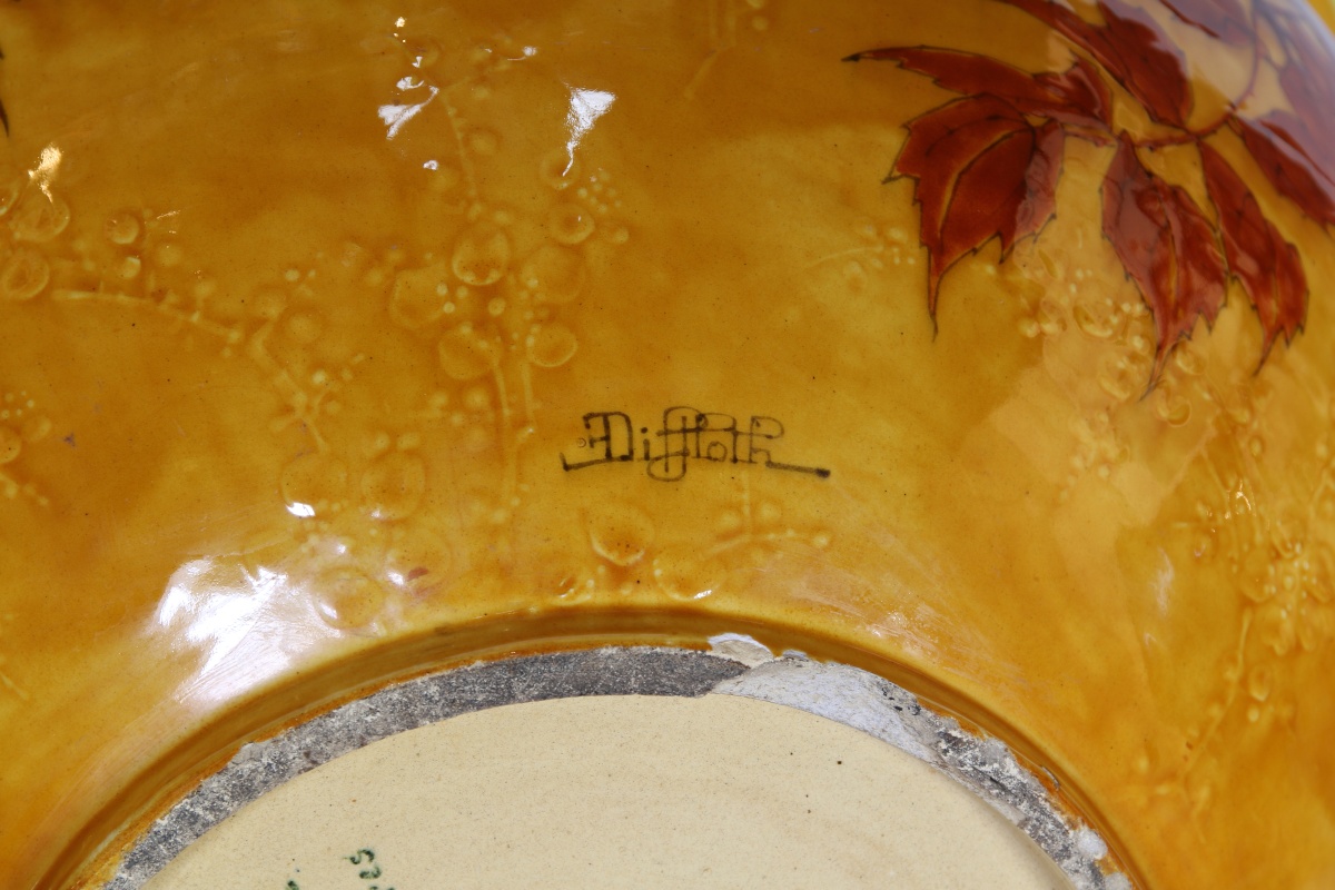 Spécialiste des procédés de décor en relief et des craquelés, Émile DIFFLOTH (1856-1933) est l'un des peintres de la manufacture d'Optat MILET (1838-1911), active à Sèvres à partir de 1866 et qui remporte une médaille d'or à Paris lors de l'exposition Universelle de 1889. Milet, qui fut formé par la Manufacture de Sèvres avant d'ouvrir son propre four, est notament réputé pour avoir su retrouver le rouge de cuivre inventé par les Chinois. Notre vasque s'inspire de travaux que Théodore DECK (1823-1891) réalise à la même époque, comme en témoigne une vasque comparable, également sur une sellette de Viardot, vendue récemment à Paris (vente Aguttes, 19 juin 2013, n°24).