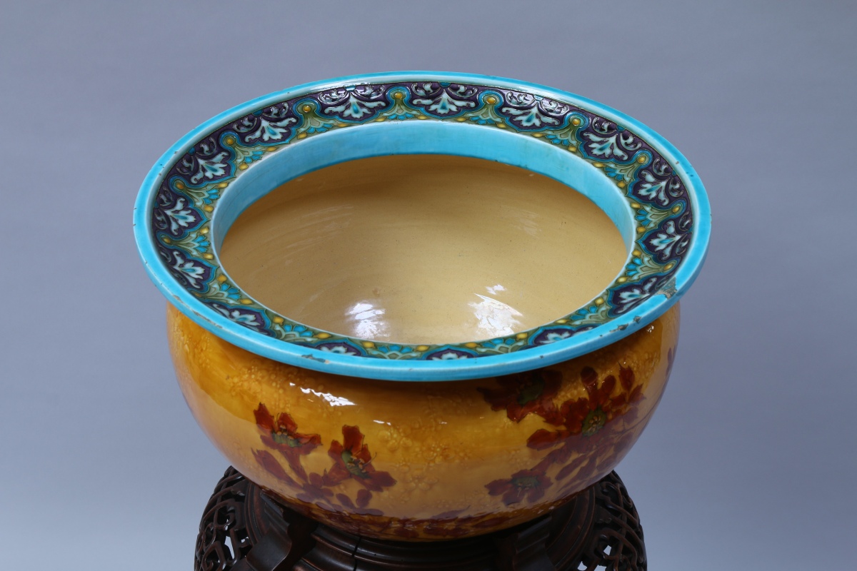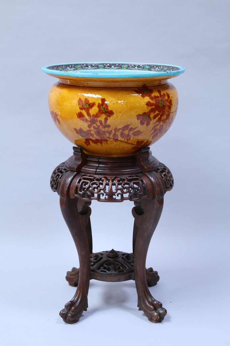 VASQUE JAPONISANTE de forme circulaire en grés émaillée à décors de bignones de couleur orangée sur fond jaune orné en léger relief de branches de cerisiers fleuris ; l'aile bleue turquoise à frise feuillagée.