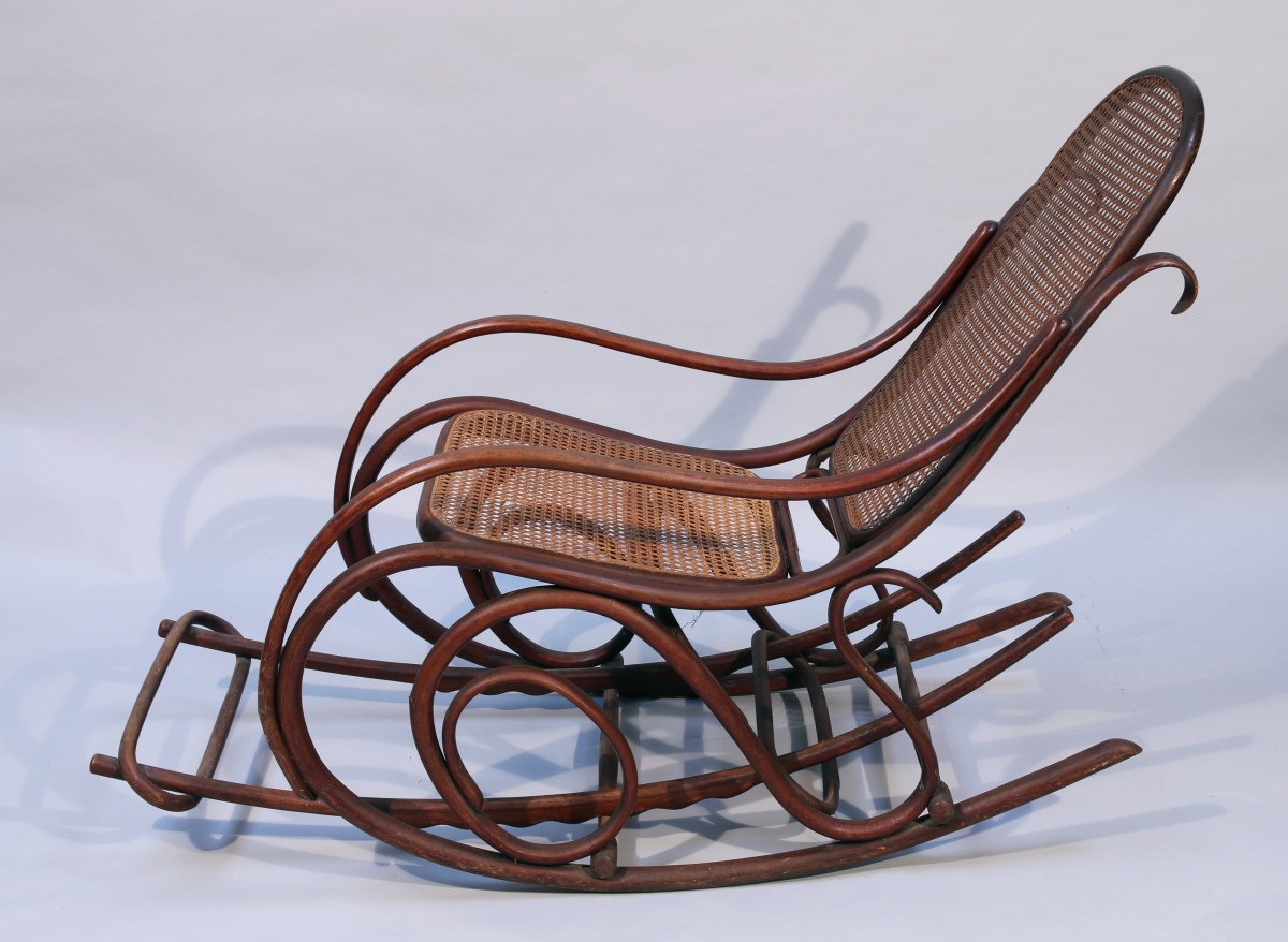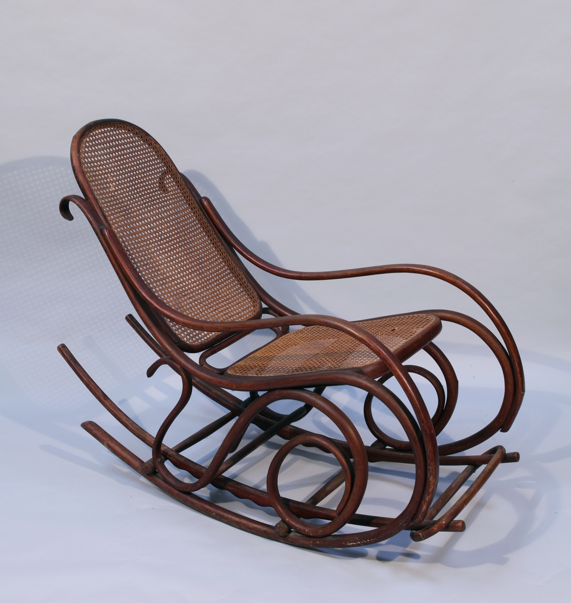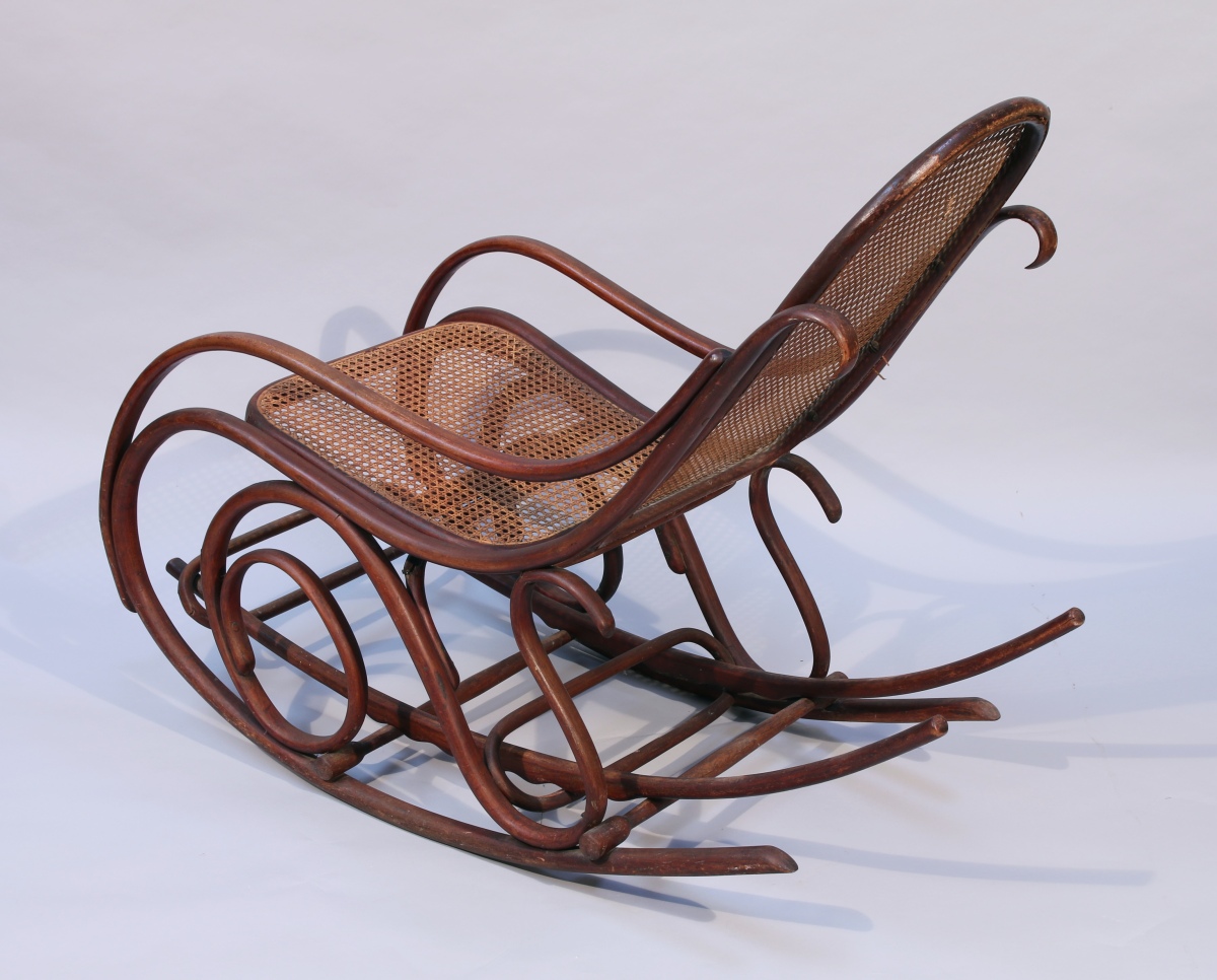 THONET. Rocking Chair en bois thermoformé à patine foncée avec repose pied amovible. La forme du fauteuil en courbes et volutes, le dossier et l'assise cannés.