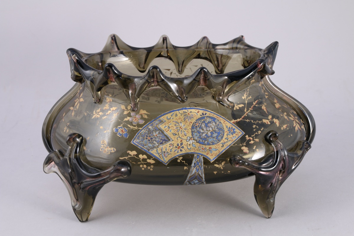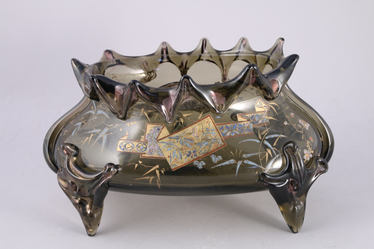 COUPE de forme pansue en verre soufflé et fumé brun ambré, au col de forme festonnée, et aux quatre pieds modelés à chaud. Décor en verre émaillé polychrome à l'éventail, feuilles de bambou, fleurs et papillons.
