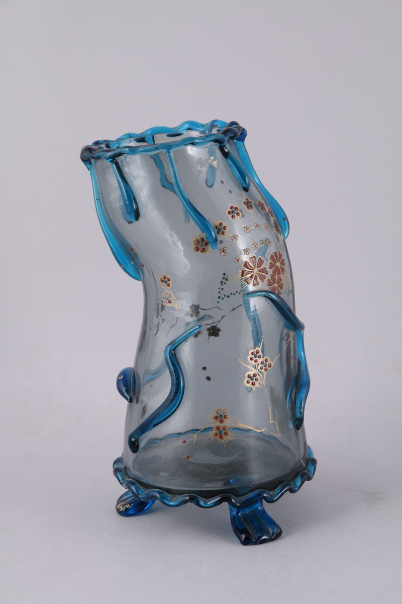 e forme tubulaire au col ondulé, avec applications de coulures imitant des tétards, décor de fleurettes en émail polychrome. Piètement tripode.