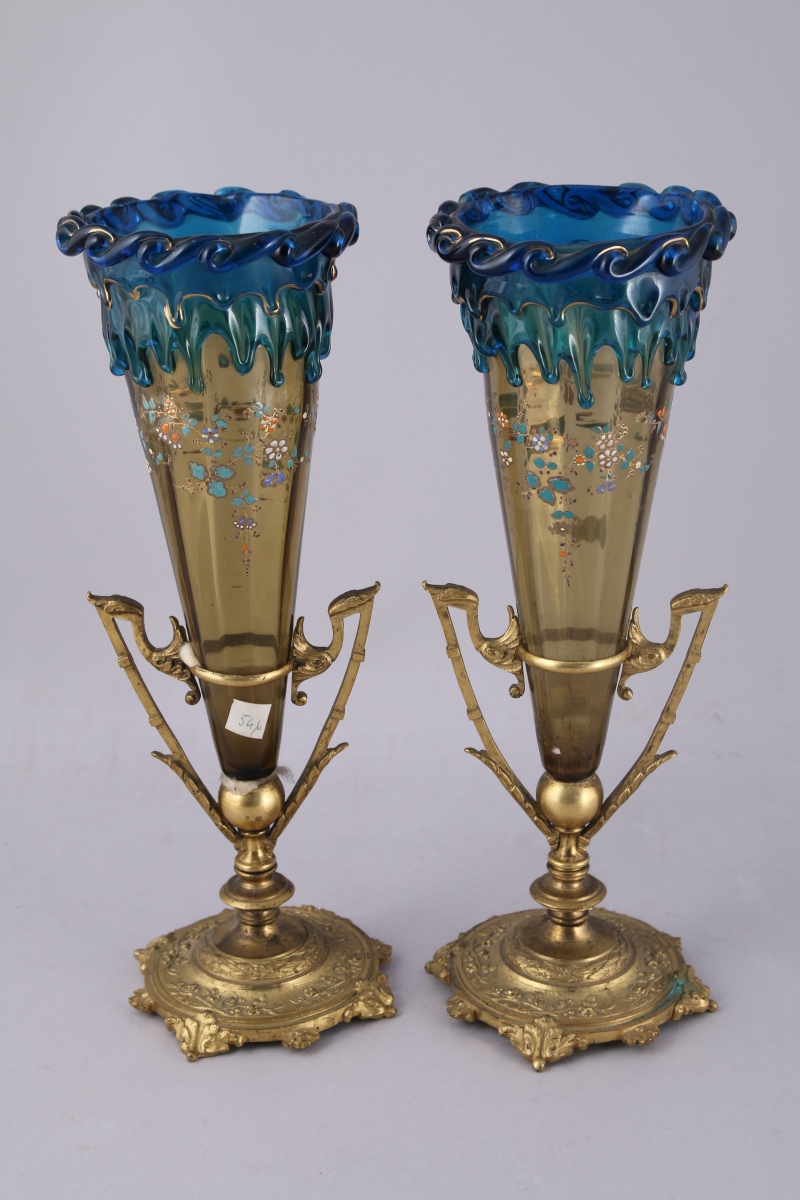 PAIRE de VASES cornets en verre ambre et à montures de bronzes dorés à motifs d'acanthe, de fleurs et de lauriers. Appliques de verre bleu en coulures en forme de vagues et larmes sur le col. Décor émaillé polychrome de fleurettes.