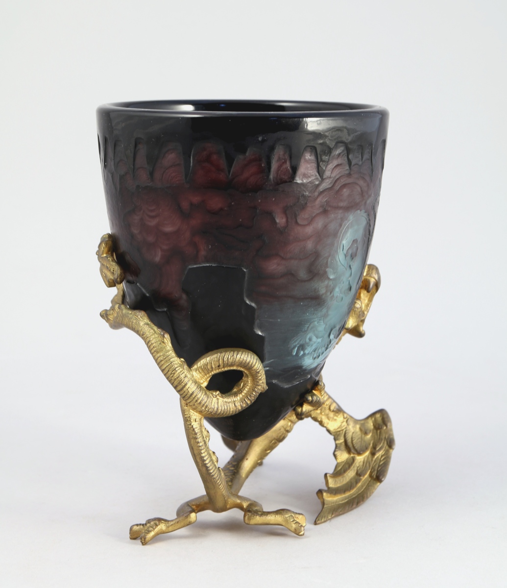 La coupe en forme de en dôme inversé en verre doublé de couleur violet, rose et transparent, dégagée à la roue d'un dragon dans les nuages. Signée à la base "L Damon / à Paris / Daum / Nancy / croix de Lorainne / fecit". Sur un piétement en bronze doré figurant un dragon renversé.
