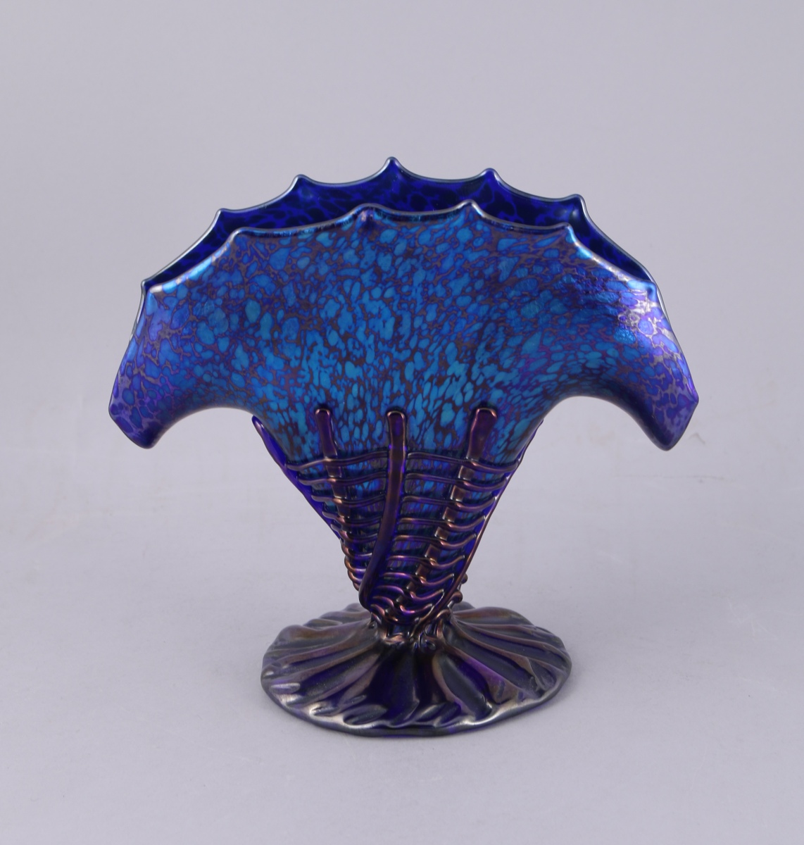 LOETZ, VASE cornet de forme éventail, en verre bleu iridescent, au col de forme lancéolée. Application de verre en motif de tressage sur la panse.