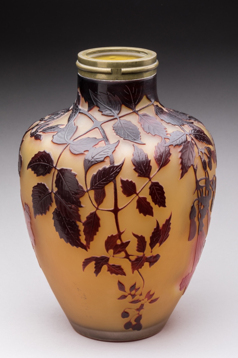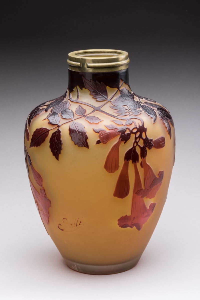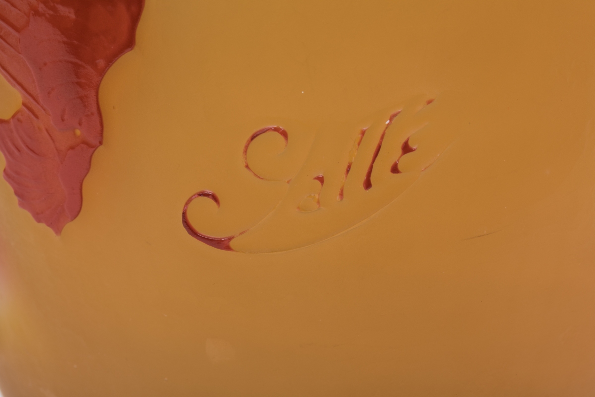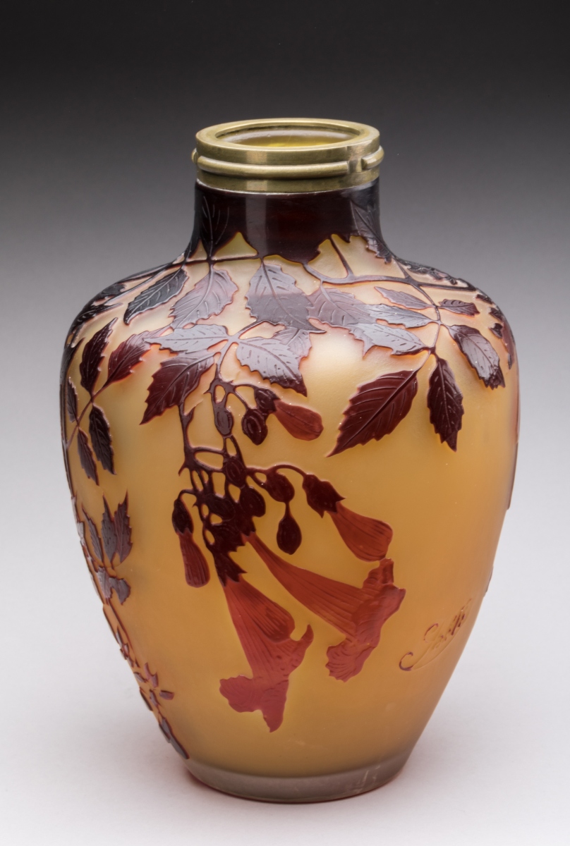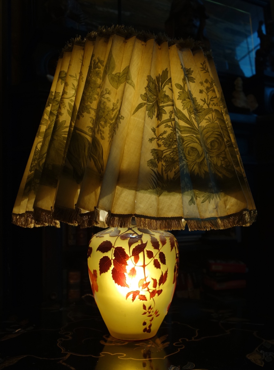 GALLÉ. VASE AUX BIGNONES à corps pansu en pâte de verre dégagé à la roue, de couleurs pourpre et clair. Le col monté et électrifié en lampe, sans abat-jour.