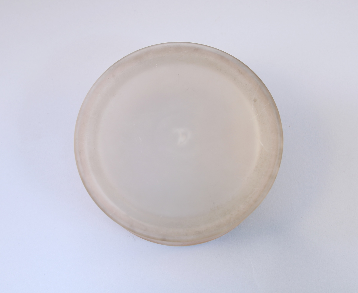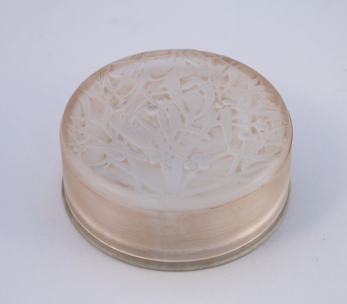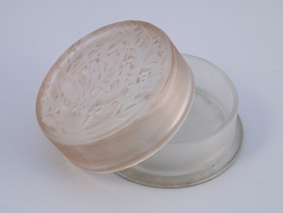 LALIQUE (1860-1945). BOÎTE À POUDRE de forme ronde, modèle "Gui", en verre incolore pressé et moulé. Le couvercle légèrement bombé à décor de rameaux de gui entrelacés. Signée " R.Lalique" et marque au masque des verreries d'Alsace. Modèle créé en 1920.
