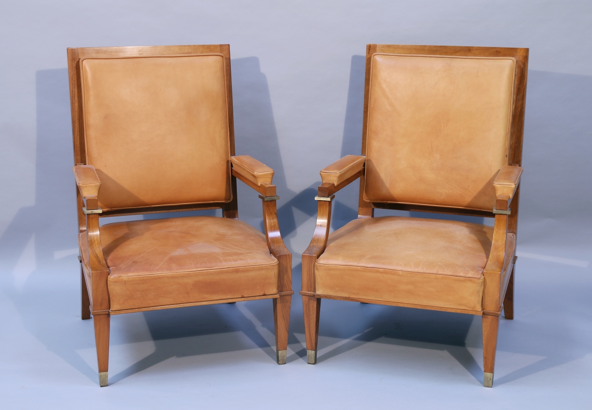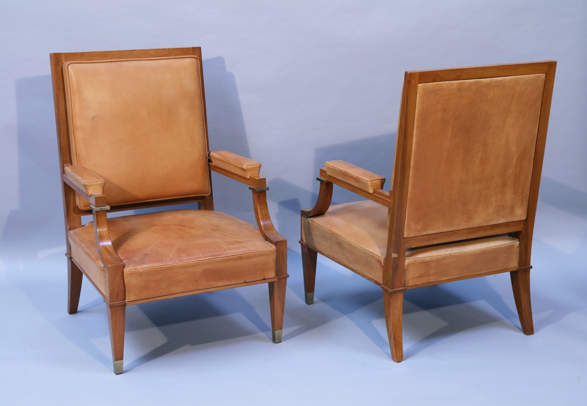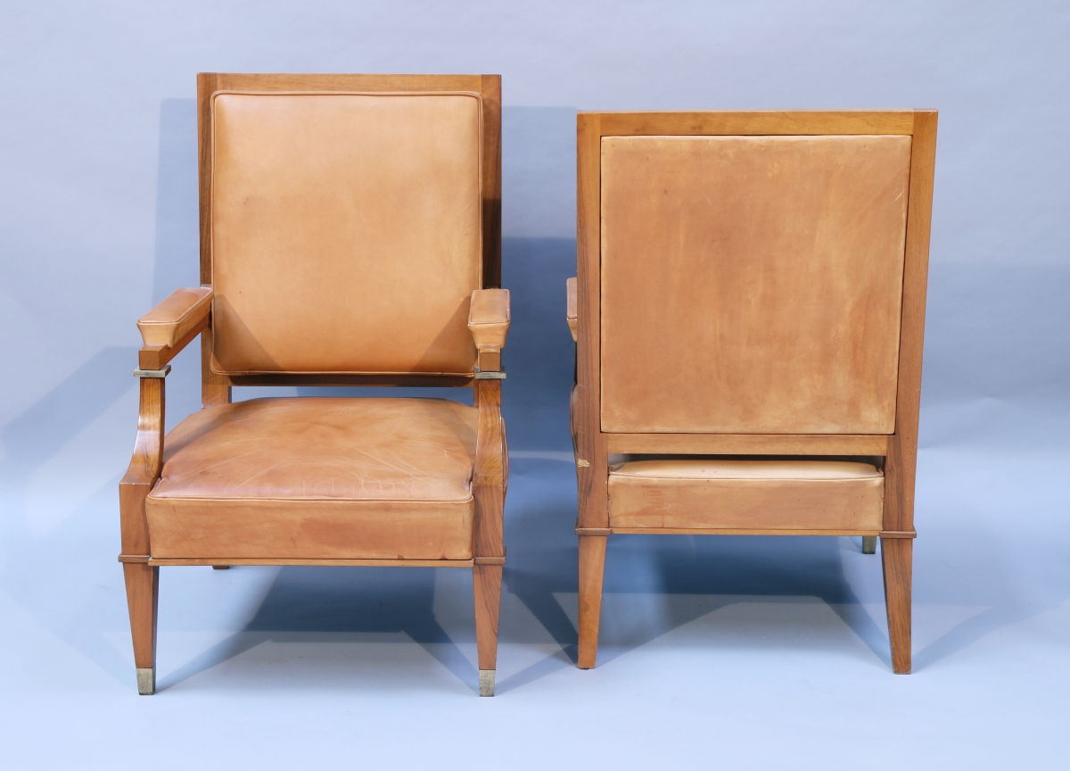 en noyer, accotoirs avec appliques de bronze, recouvert d'un cuir Hermès gold.