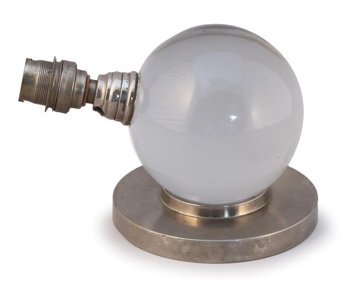 Boule de cristal transparent sur un socle circulaire en bronze nickelé. Bague en inox. Électrifiée.