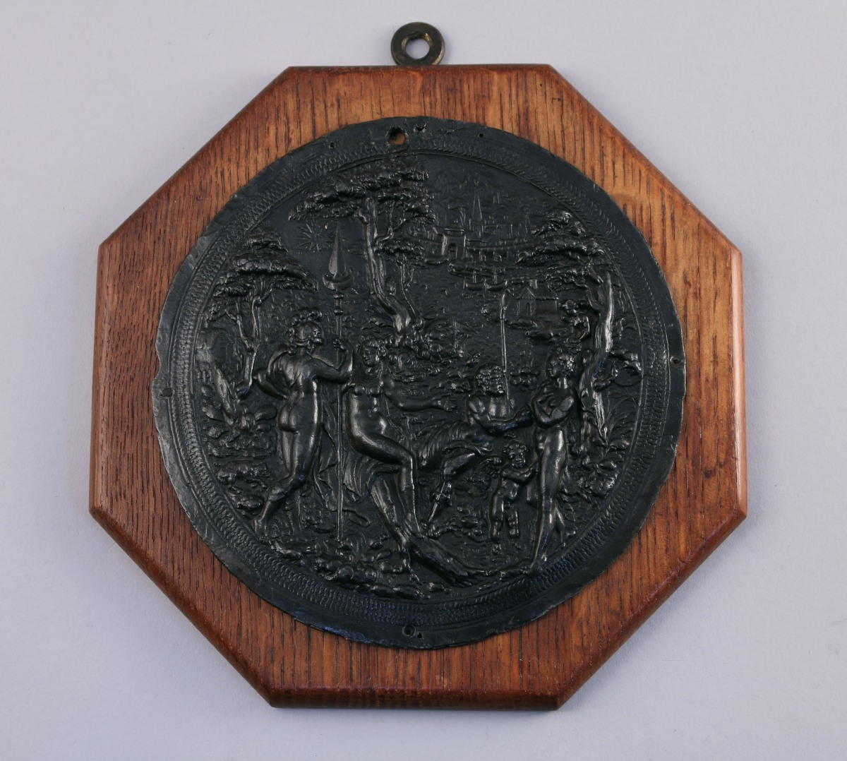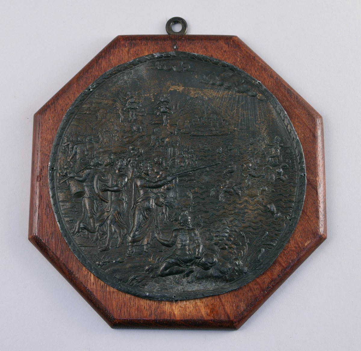 - d'après l'école du XVIe. Le Passage de la Mer Rouge. Plomb anciennement doré. Diam. 15,5 cm. Composition proche de l'oeuvre de Cosimo Rosselli "Passage de la Mer Rouge".