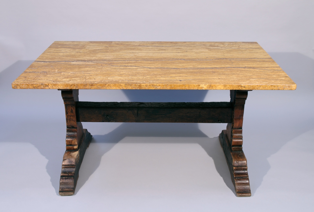 Piètement en bois naturel à patins réunis par une traverse d'entretoise. Pieds et montants moulurés. Plateau en travertin jaune.