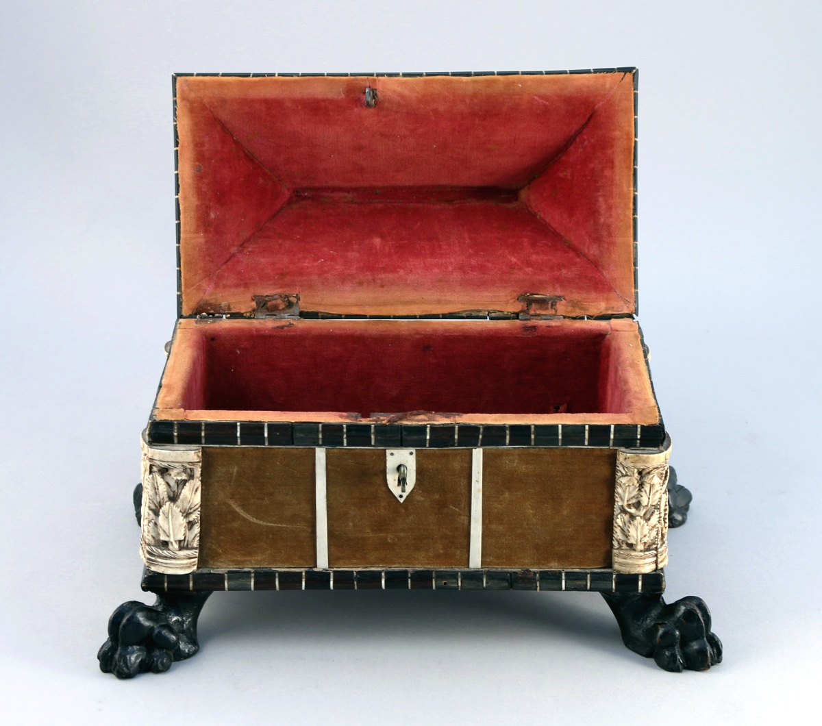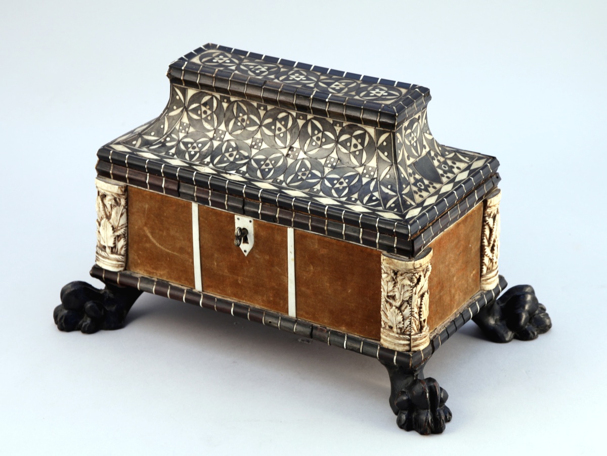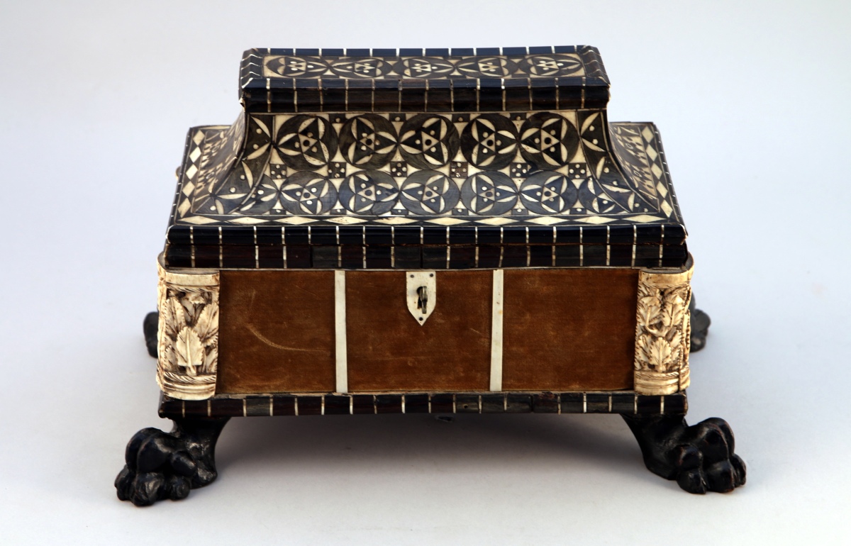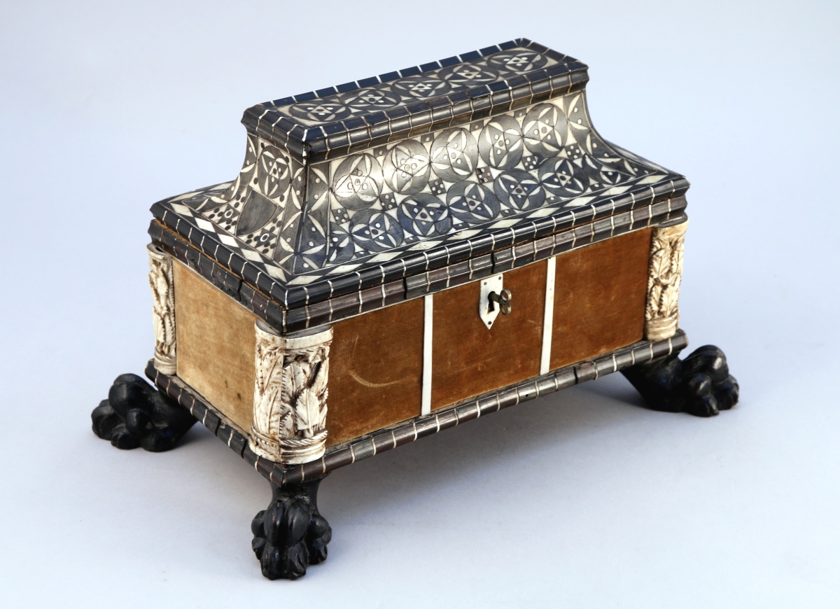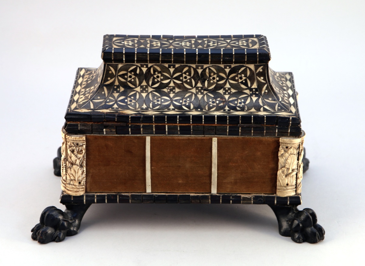 Le couvercle orné d'une marqueterie géométrique en os et corne teintée noir. Les quatre montants arrondis sont appliqués de deux plaquettes en os sculpté de feuillages présentant des traces de dorure. Il repose sur quatre pattes de lion.
