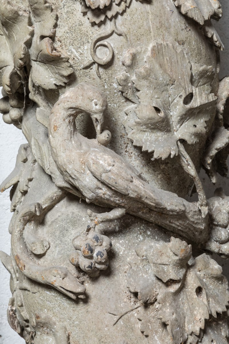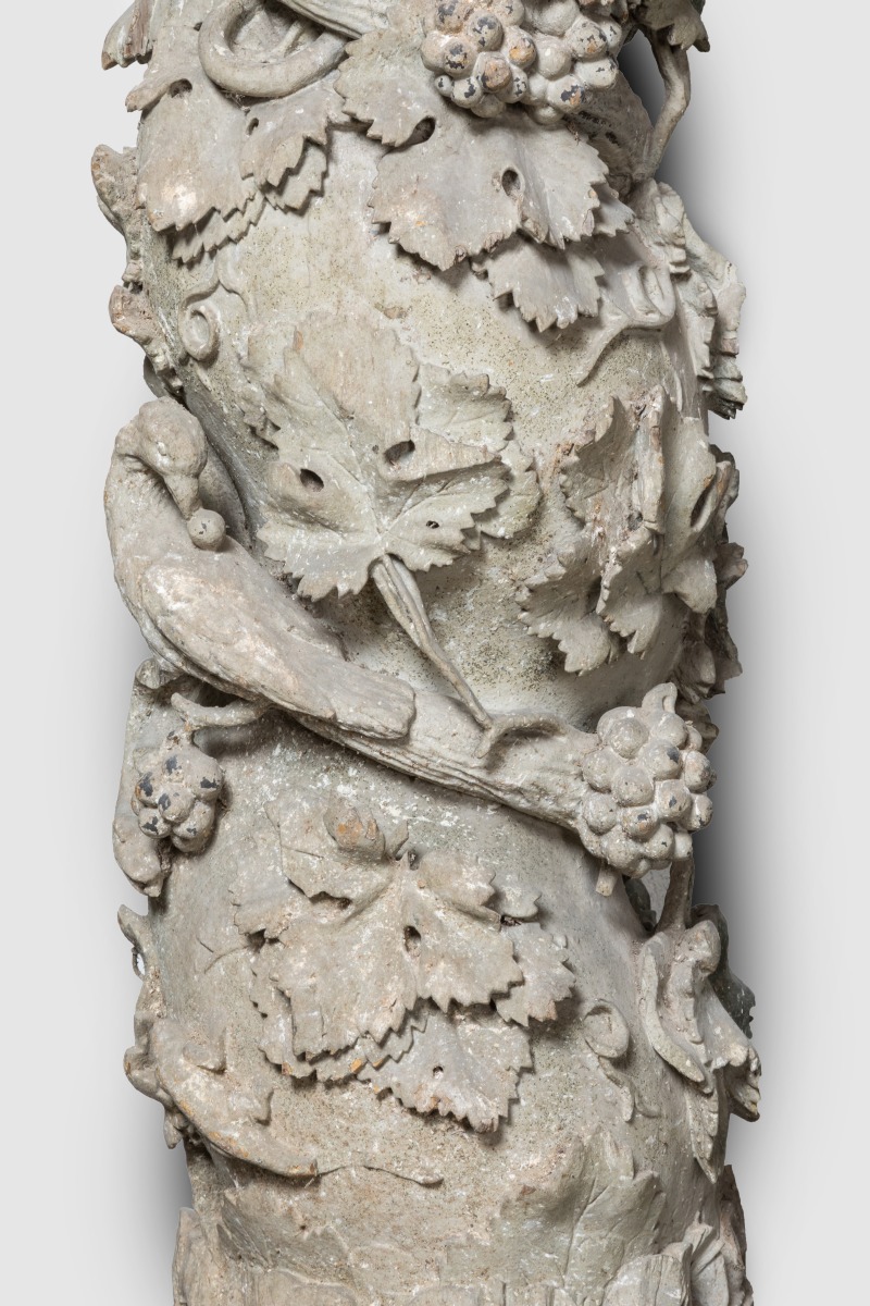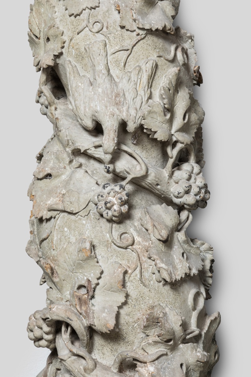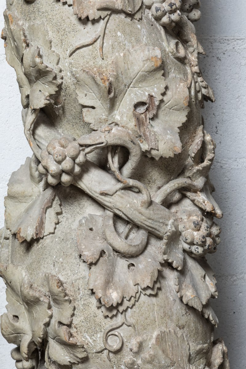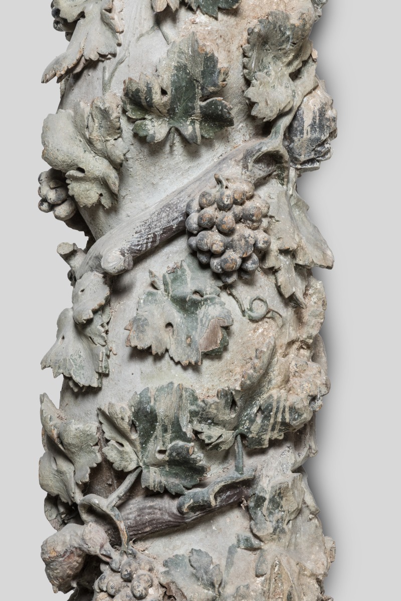 Ces quatre colonnes proviennent probablement du même décor et manifestent de l'influence indiscutable des nouveaux décors baroques italiens: c'est en effet en s'inspirant des colonnes torsadées provenant, selon la tradition, du Temple de Salomon (conservées dans la crypte de la tombe de saint Pierre à Rome) que Gian Lorenzo Bernini (1598-1680) construisit le baldaquin surmontant l'autel de la basilique dans le premier tiers du XVIIème siècle. Ce type de colonne, dit " salomonique ", connut un vaste succès en Italie et en Espagne, mais également, en Normandie. C'est probablement localement que le Comte de Reiset trouva ces éléments d'architecture, dont le rapprochement stylistique avec les créations de l'artiste rouennais Michel Lourdel est évident. Bien qu'ayant perdu une bonne part de leur polychromie, ces colonnes ornées de rinceaux, grappes et feuilles de vigne habités d'oiseaux et autres charmants animaux sont à comparer aux colonnes des maîtres-autels de Caorches-saint-Nicolas ou de l'église d'Emanville attribués à Michel Lourdel. Ces quatre colonnes sont attestées encadrant l'autel de l'église restaurée de Breuil-Benoît dès 1891.