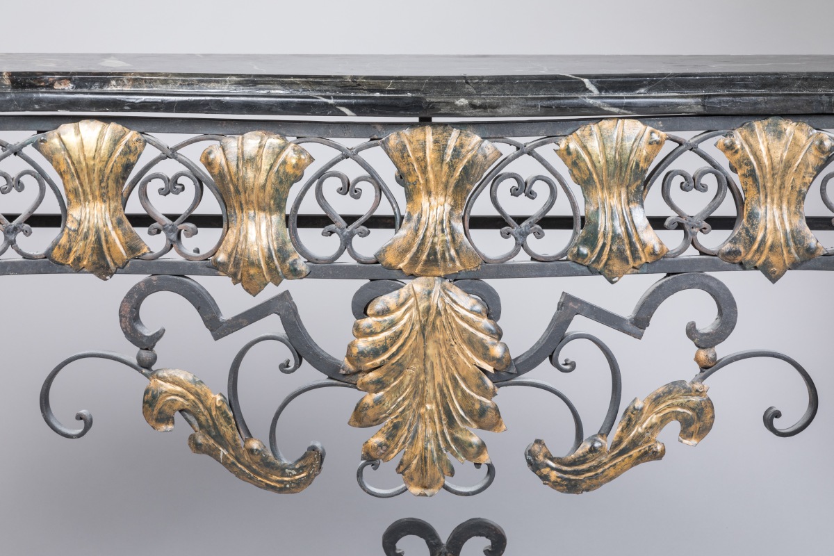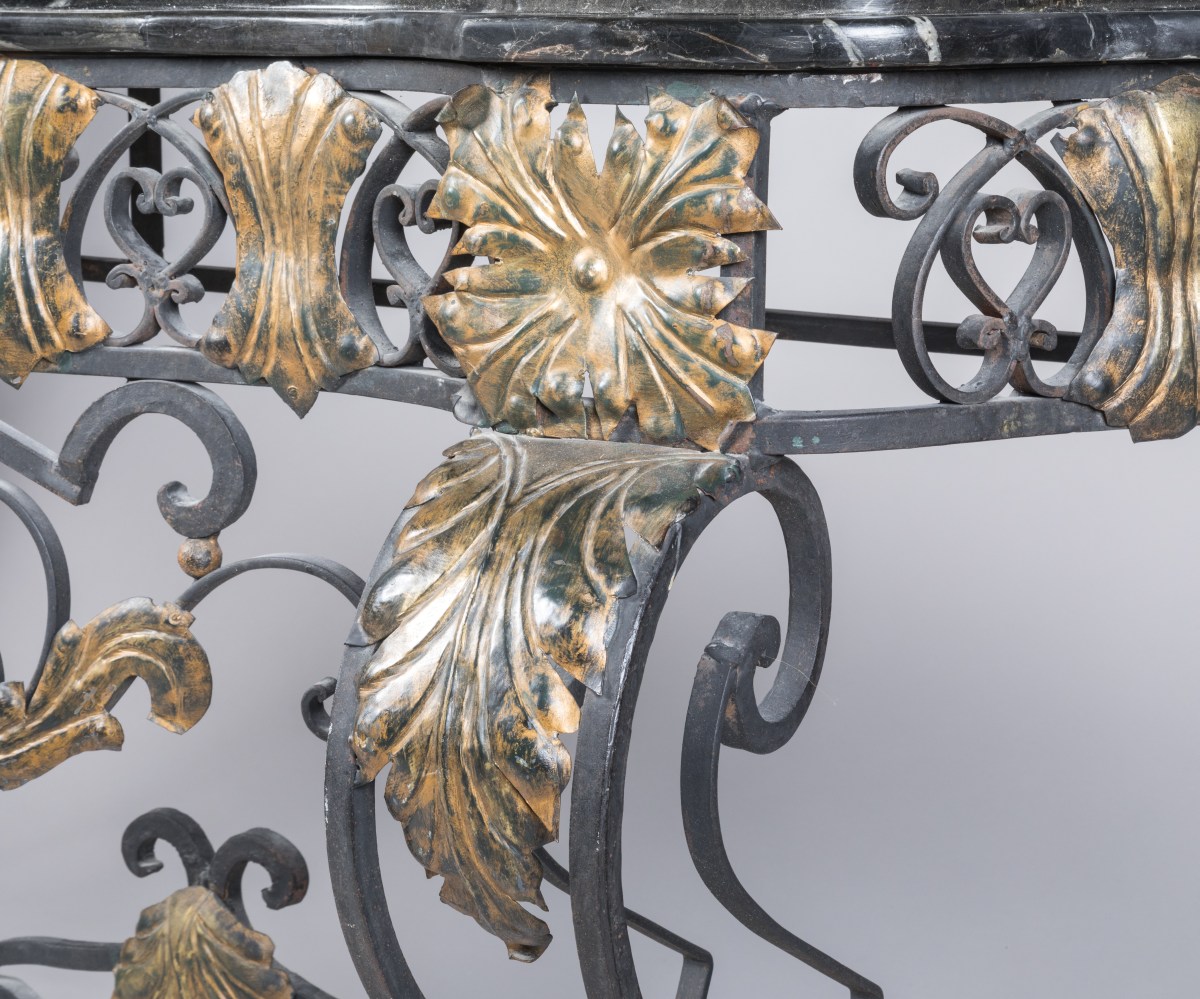 laqué noir de forme mouvementée. Elle reçoit un décor de ferronneries agrémentées de feuilles d'acanthe et fleurons en tôle emboutie et dorée. La ceinture galbée est ajourée d'une frise de curs. Côtés évasés. Elle repose sur six pieds en console à enroulement. Les quatre pieds antérieurs sont réunis en paire. Dessus de marbre noir veiné à degré.
