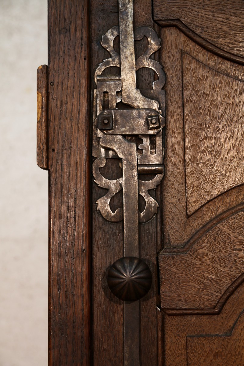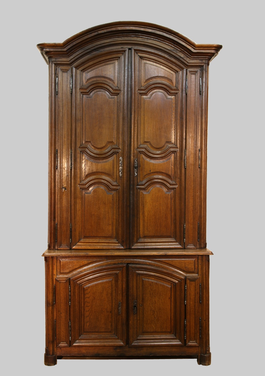 BUFFET DEUX-CORPS dit DE PRÉSENTATION en chêne mouluré ouvrant en façade par quatre vantaux brisés. La partie supérieure en léger retrait. Montants arrondis, corniche cintrée dite en chapeau de gendarme. Ferrures en fer telles que crémones à bouton godronné et charnières à attaches ajourées.