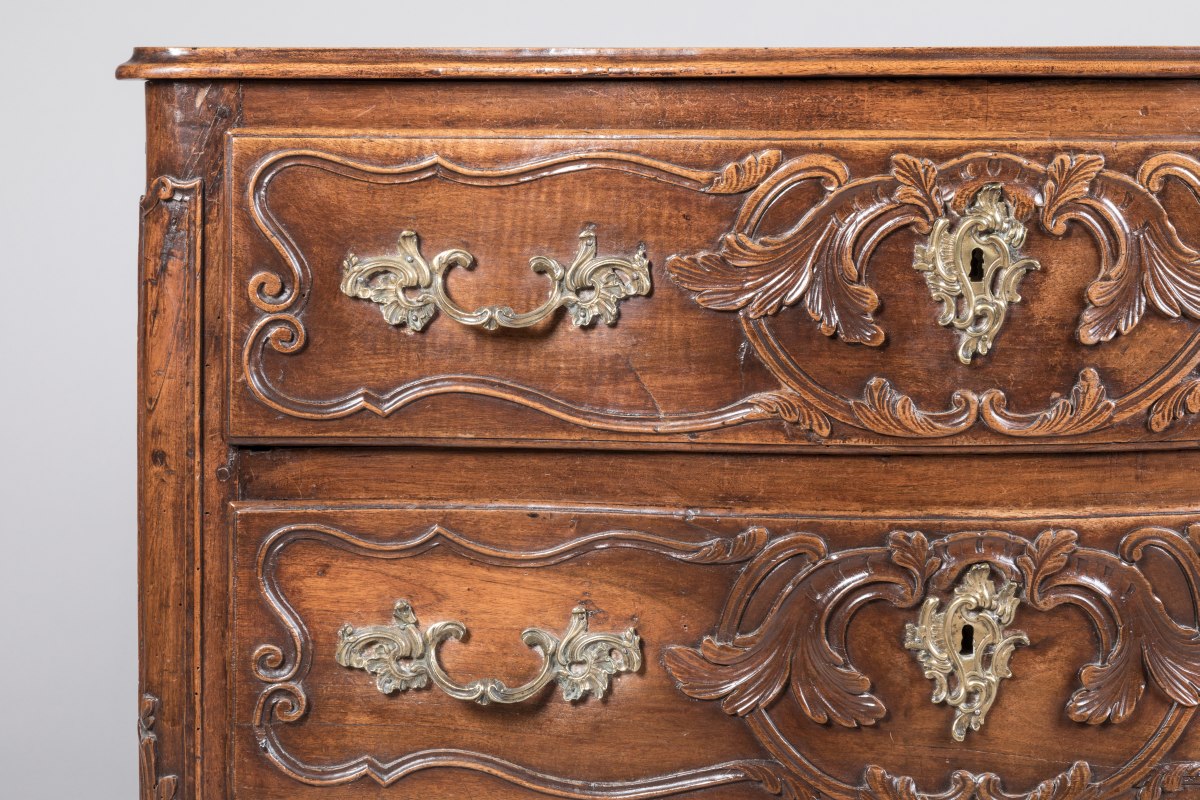 en noyer richement mouluré et sculpté. Elle ouvre par deux tiroirs en façade qui accueillent un décor de feuilles d'acanthe, enroulements et agrafes feuillagées. La traverse de façade chantournée présente un généreux cul-de-lampe ajouré de larges feuilles d'acanthes. Elle repose sur quatre pieds cambrés à enroulements.