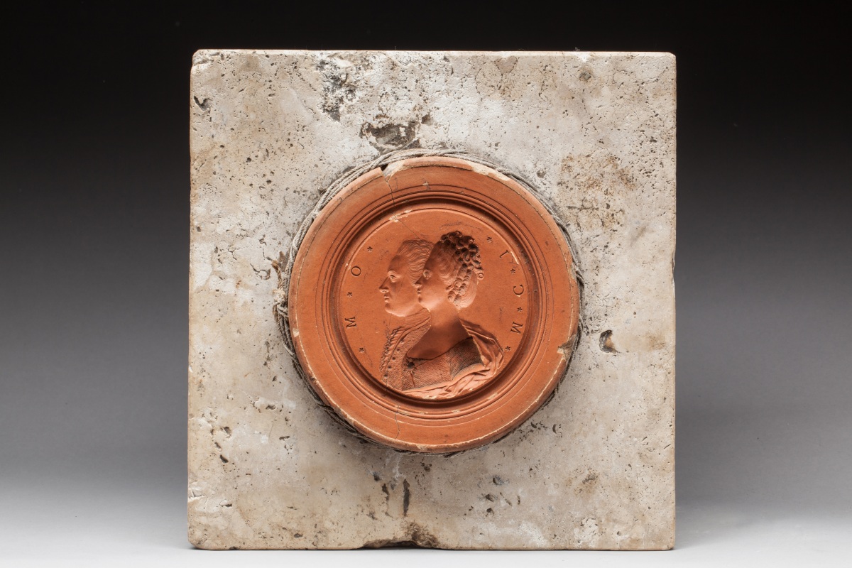 Inscription: sur le pourtour du médaillon "M.C.J / O.M.B " (ponctué de sept rosaces); signé et daté en creux sous la tranche du buste "NINI F 1775".