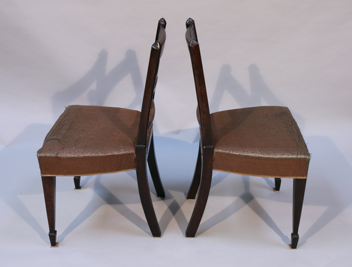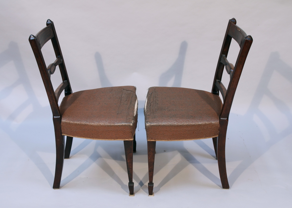 en bois teinté à la façon de l'acajou et placage d'acajou. Dossier de forme trapézoïdale à montants et traverses godronnés. La traverse supérieure incrustée de filets de bois clair. Elles reposent sur quatre pieds, les antérieurs en gaine, les postérieurs en sabre.
