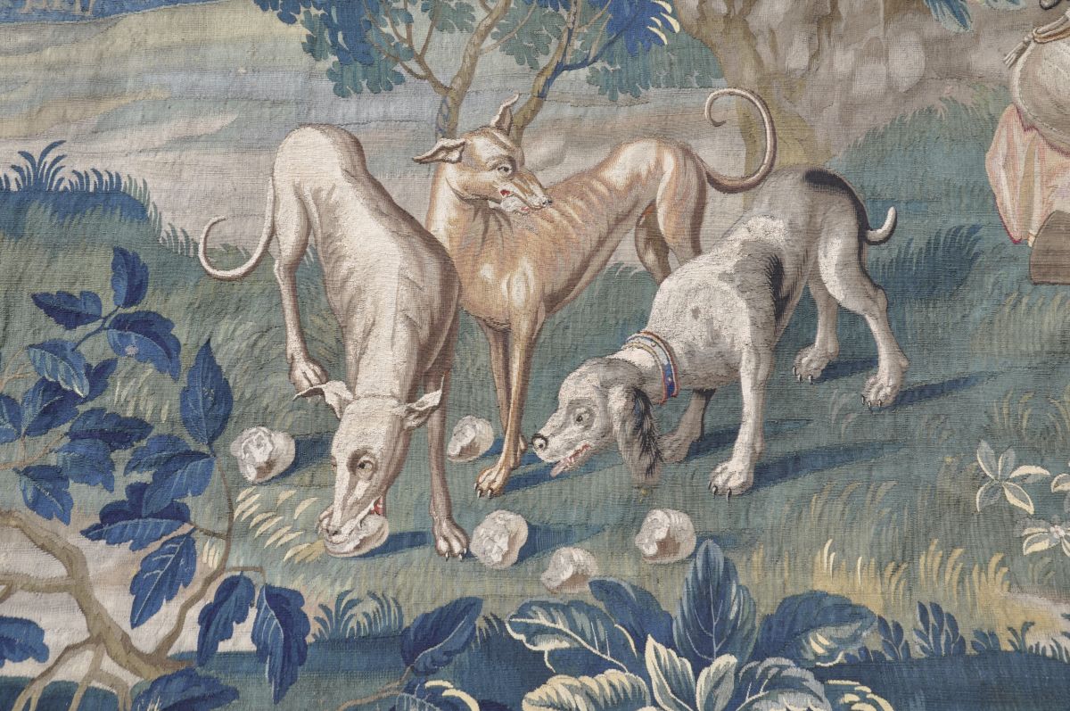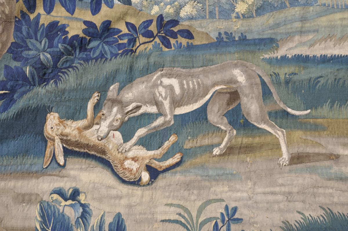 Cette grande, pittoresque et fine tapisserie est à décor d'une clairière. À droite de la composition, un groupe de trois chasseurs, dont l'un porte un vêtement rouge vif, partagent une collation, après une chasse au lièvre. On aperçoit à côté d'eux des fusils et un lièvre, ce qui livre un tableau de chasse assez restreint... Mais la journée n'est pas finie. À leur gauche, trois chiens semblent également se restaurer tandis qu'un quatrième attrape dans sa gueule un gibier et qu'un autre lièvre décampe vers la gauche de la composition.