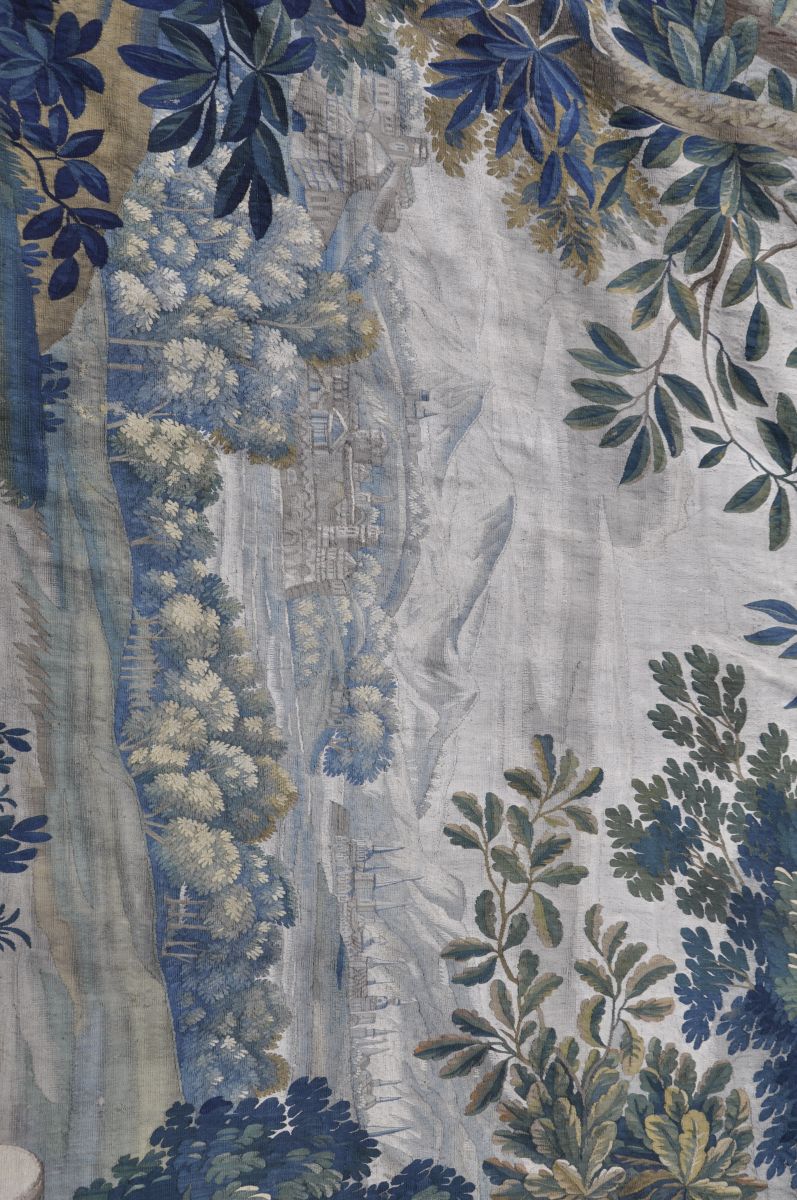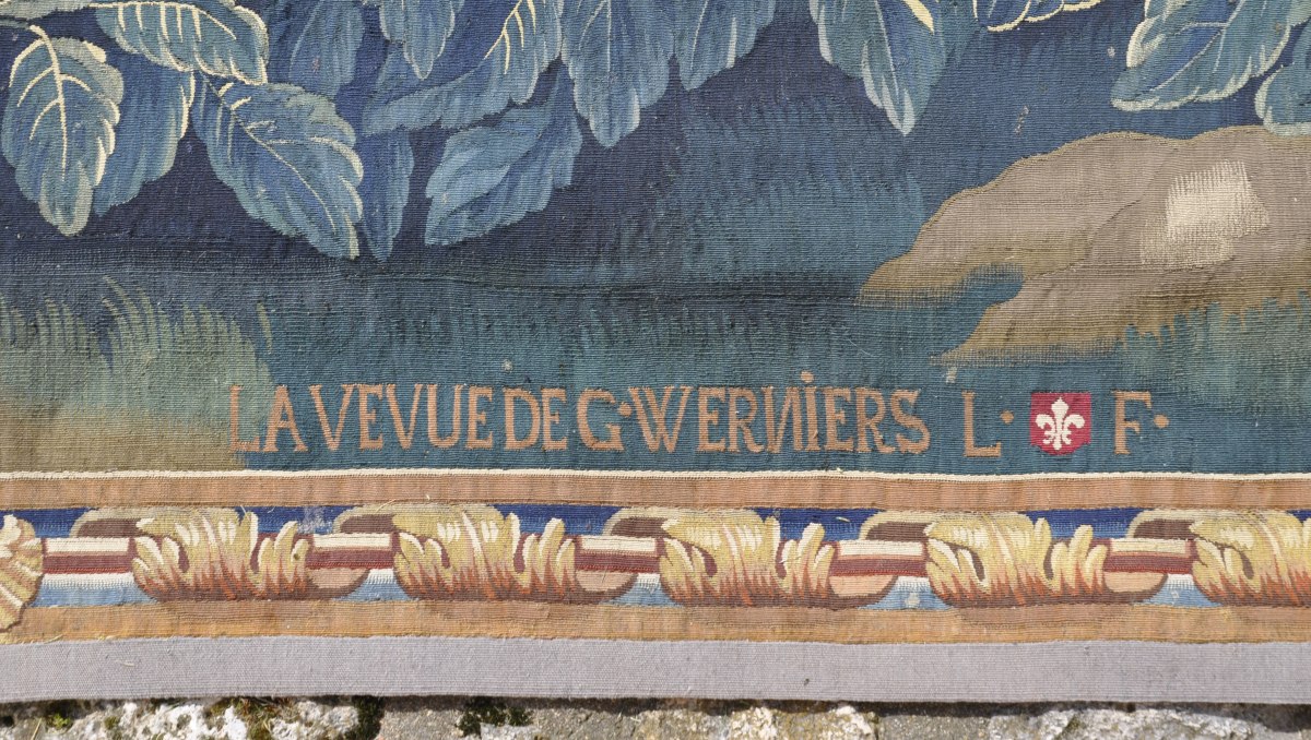 Armoiries de la ville et signature de l'atelier dans le bas de la composition: de gueules à une fleur de lys d'argent entre les lettres L et F et VEUVE DE GUILLAUME WERNIERS, active de 1738 à 1778.