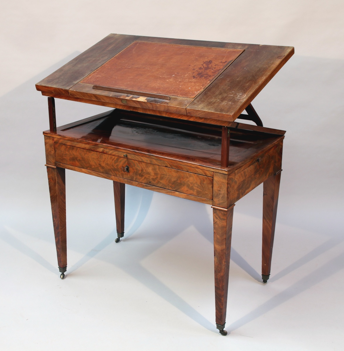 et placage d'acajou flammé. Elle présente un plateau à double évolution inclinable par un système de crémaillère et un bouton pression. La partie centrale du plateau inclinable de façon indépendante forme écritoire ; il est tendu d'un cuir havane à décor de petits fers. La table ouvre à deux tirettes latérales et un tiroir en façade présentant une tablette coulissante foncée d'un cuir havane à décor de petits fers et un plumier coulissant en acajou. Piètement fuselé à section carrée, se terminant par des roulettes.