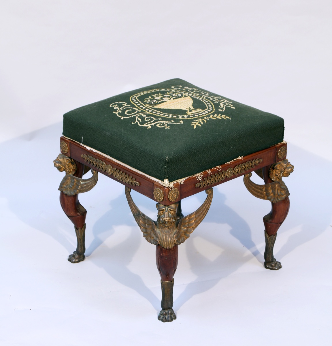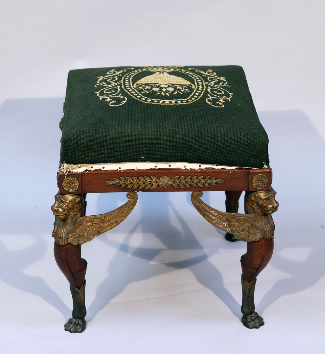 Inspiré du mobilier dit "Retour d'Égypte" dessiné par Percier et Fontaine et réalisé par la dynastie Jacob pour les palais du premier Empire, ce tabouret appartient à une petite série -peut-être un salon dispersé- dont ont été localisés deux autres exemplaires et une banquette sur le marché de l'art international (Embree & Lake Dallas, Osenat Fontainebleau, Leslie Hindman Chicago). La qualité des bronzes et la solidité de l'assemblage indique un travail parisien de qualité pour un amateur fortuné.