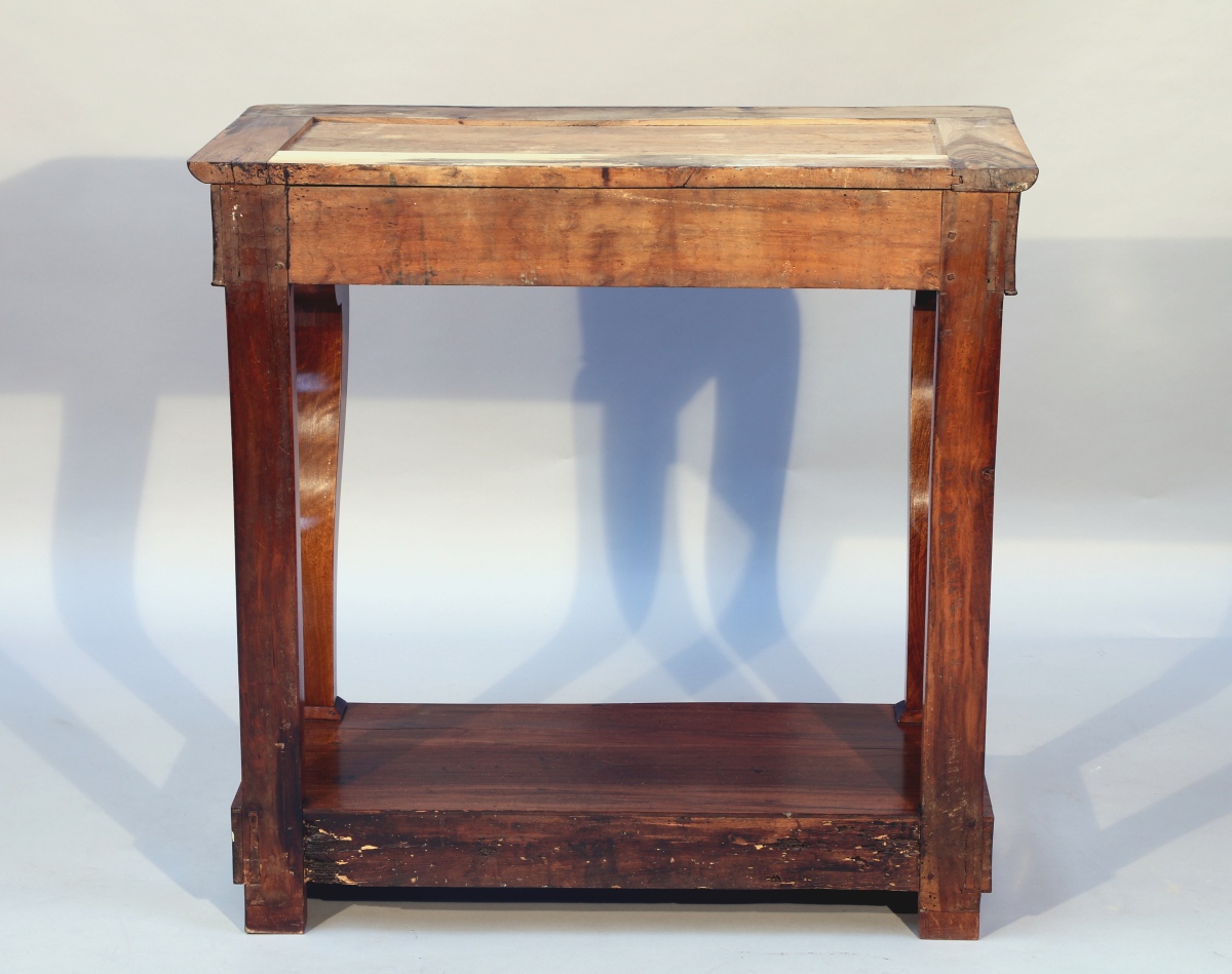 ouvrant à un tiroir en ceinture. Les montants antérieurs se terminent en volute et les montants postérieurs en pilastres droits. Dessus de marbre gris Sainte Anne.
