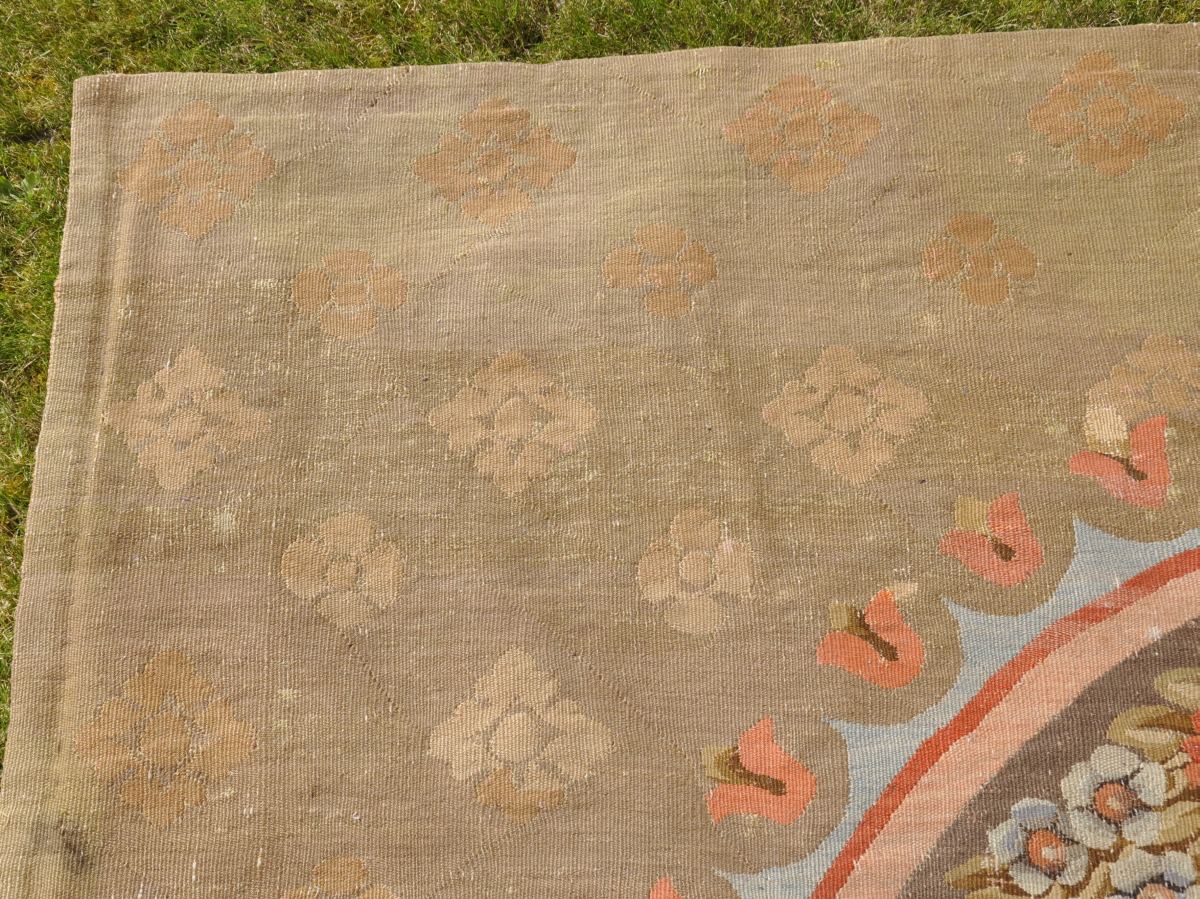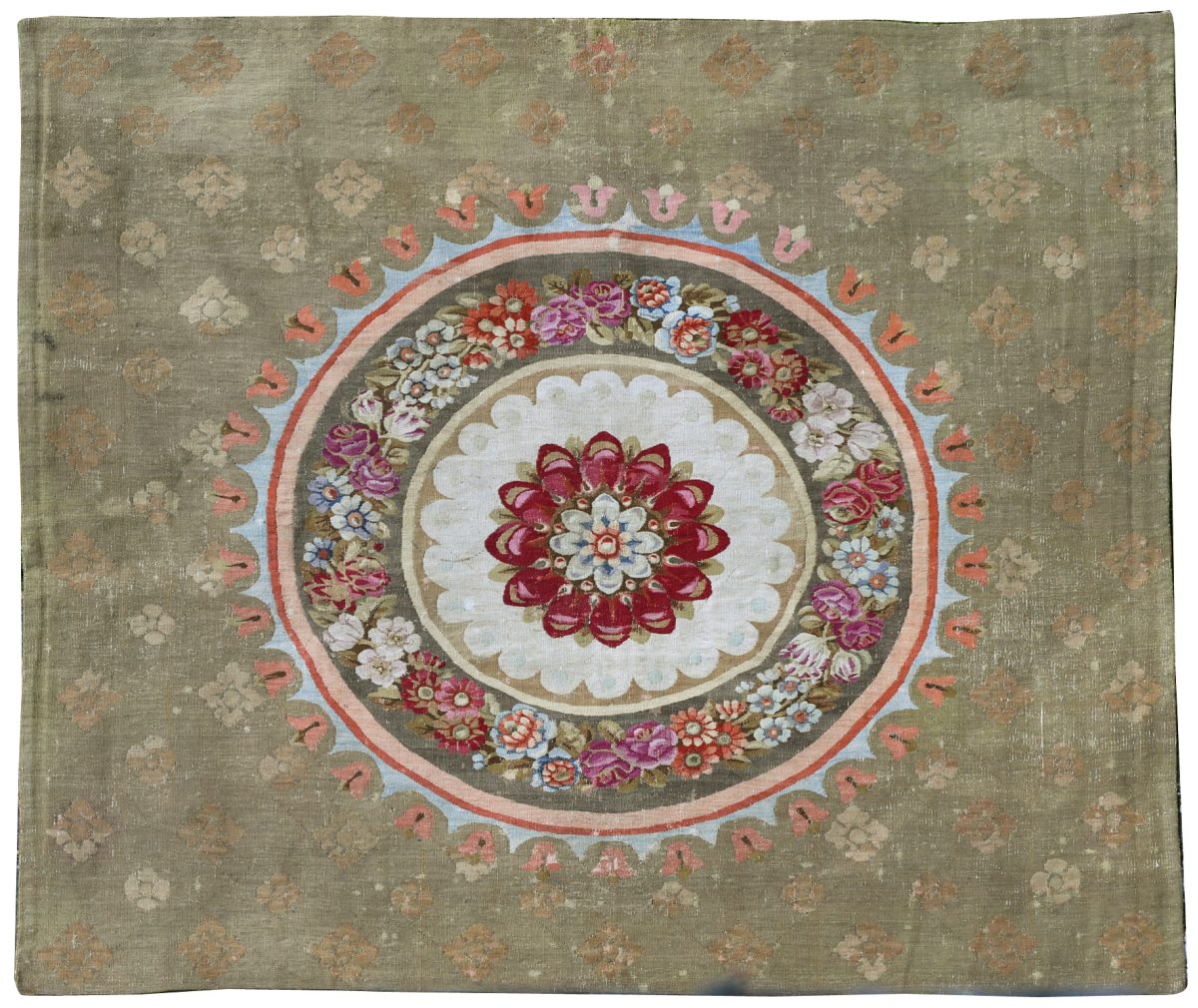 TAPIS en laine à fond vert semé de fleurons, centré d'un médaillon orné d'une rosace sur fond crème, ceint d'une guirlande de fleurs.